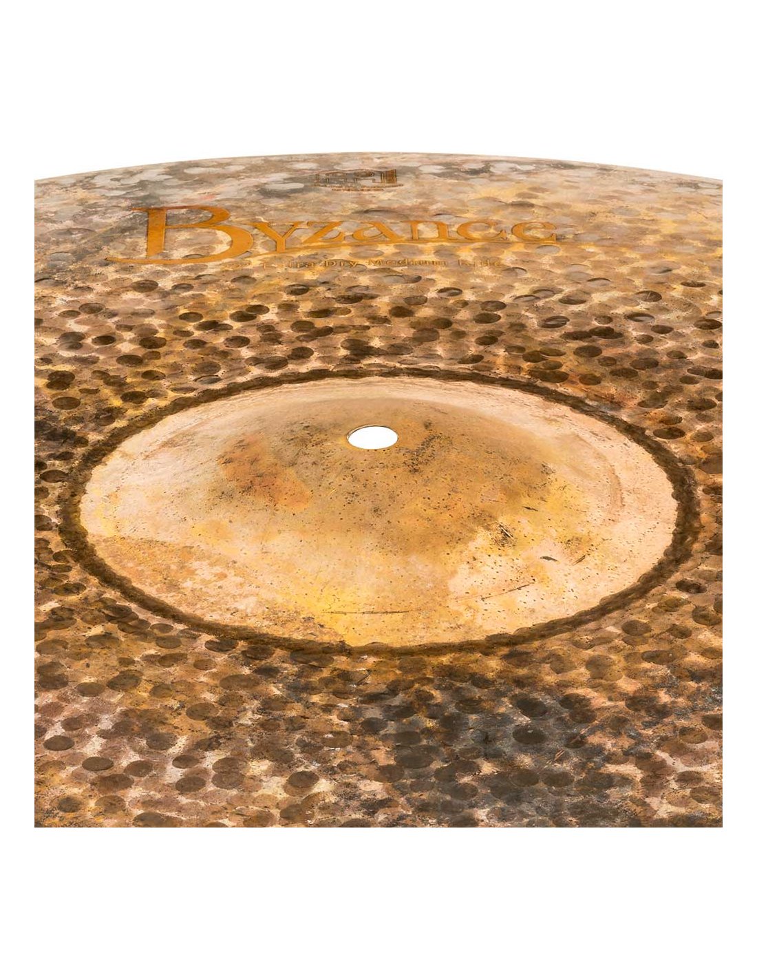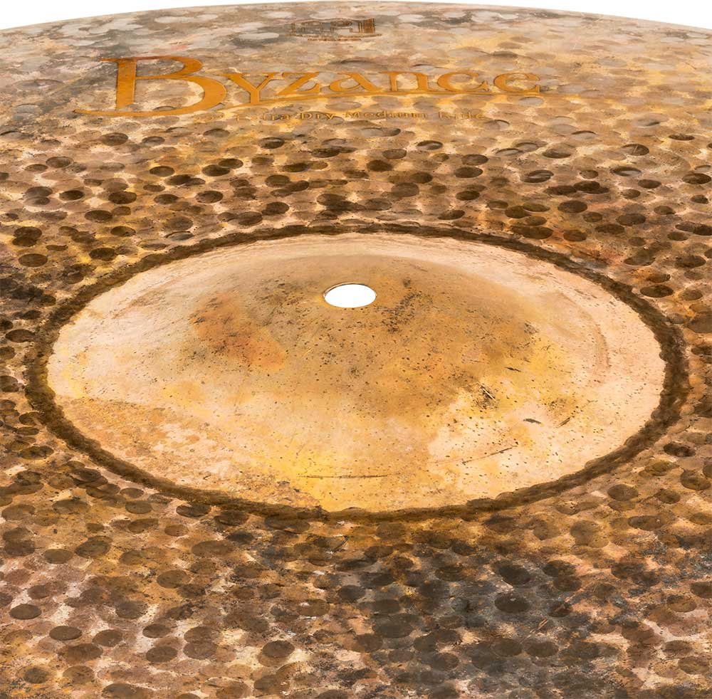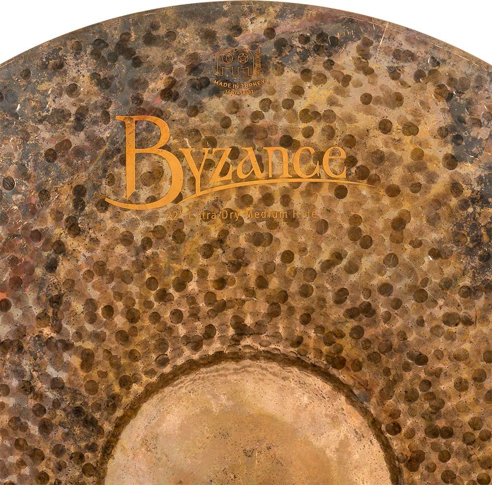 'Ride 22" Medium, Byzance Extra Dry Series. The Byzance Extra Dry series plates are handcrafted in our factory in Turkey by specialists and respecting tradition throughout the process. All plates are made with B20 bronze alloy discs. Several techniques are involved in the process, both hammering and turning. The unlathed top finish and the larger diameter hammered finish together with the fully lathed bottom of the plate make the series unique. With an explosive sound, a bit trashy and with little sustain. These plates have created a completely unique new sound universe.