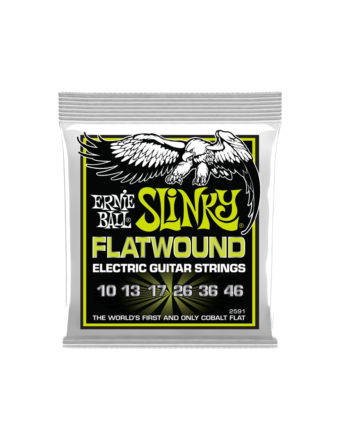 2591 is the electric guitar string set from Ernie Ball's “Slinky Flatwound” series with a scale of 10-46, made with smooth-coated strings. Each string is wrapped with a patented cobalt alloy ribbon, to return a natural and round sound, ideal for playing