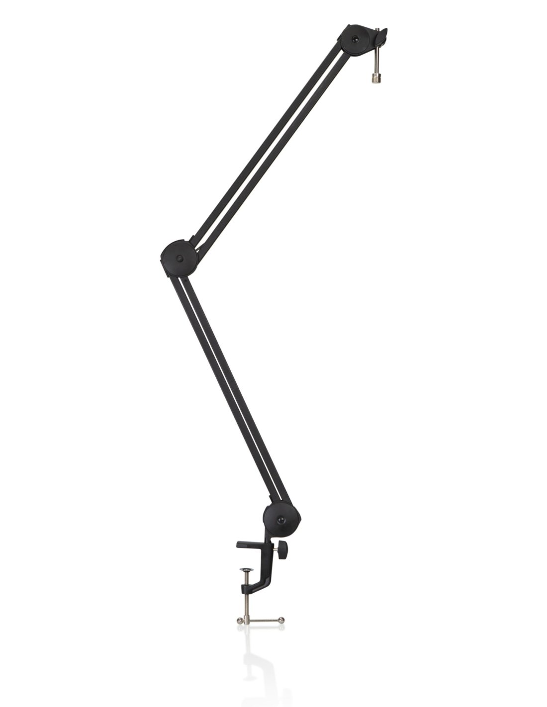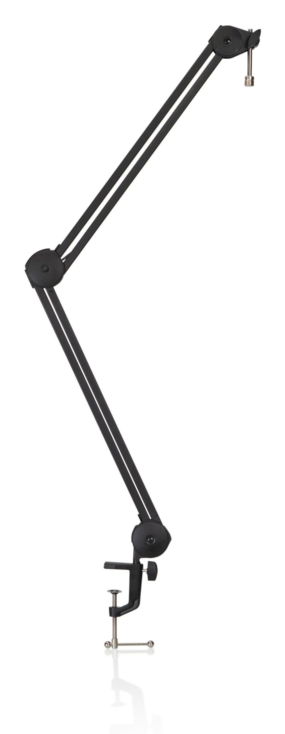 Ideale per Broadcast/Podcast e registrazioni - Braccio articolato, caricato a molla, con estensione massima di 980 mm e carico massimo di 1,1 kg - Ruotabile a 360° - Si monta facilmente mediante morsetto su scrivanie, tavoli e superfici con spessore massimo di 55,1 mm - Terminale regolabile filettato di lunghezza 70 mm - Costruzione in acciaio in finitura nera - Dimensioni: 465 mm (braccio inferiore), 460 mm (braccio superiore) - Peso: 1,5 kg