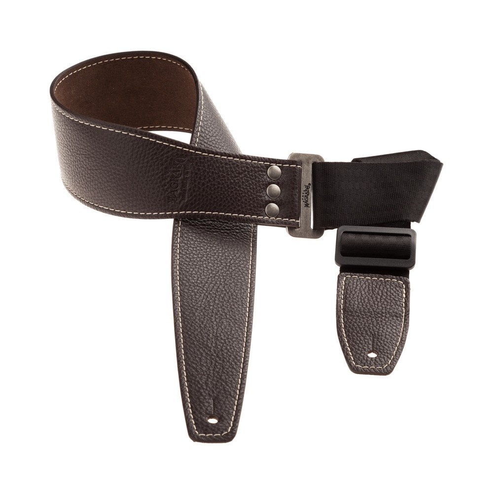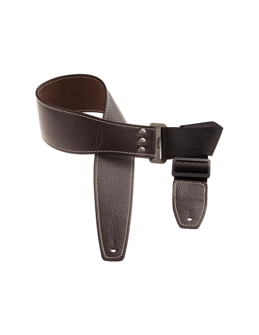 MAGRABO' STRIPE SS HAMMER COLORS EBONY 7 CM. Strap for guitar and electric bass made of high quality Stripe leather 100% Made in Italy, dark brown microfiber inner layer, ecru cotton stitching, nylon adjustment tail with the possibility of making custom sizes, antique silver plated zamak buckle for quick attachment/release adjustment tail, width 7 cm and adjustable length from 109 to 135 cm.