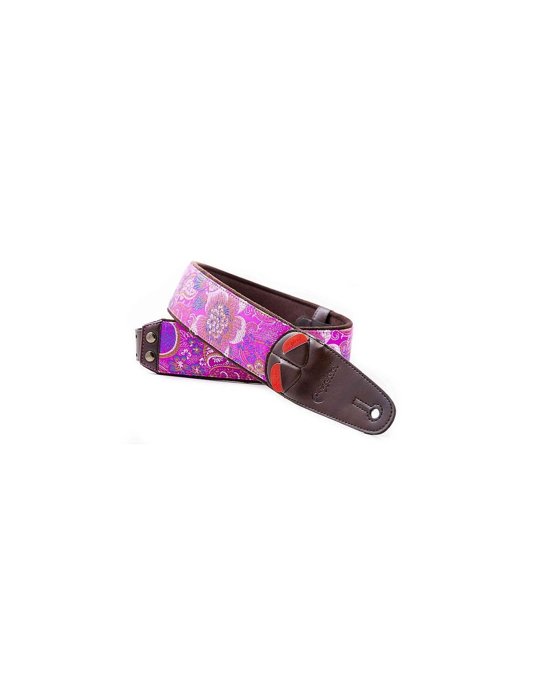 Tracolla realizzata in modo artigianale con materiali ecologici ad alta tecnologia rispettosi dell’ambiente e priva di qualsiasi tessuto animale, finiture curate in ogni dettaglio, caratterizzata da decorazioni in stile giapponese, imbottitura in lattice ad alta densità (5 mm), sistema di regolazione RAS, porta plettri incorporato. Colore rosa accesso, larghezza 6 cm, lunghezza regolabile da 100 cm a 150 cm, ultra leggera. Indicata per chitarra e basso.