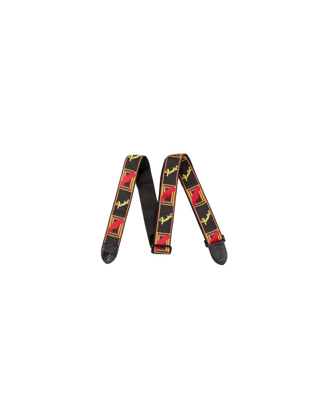 FENDER STRAP BLACK YELLOW AND RED. Guitar or bass strap with leather ends, 5 m wide, nylon bottom, Fender logos, adjustable in length from 112