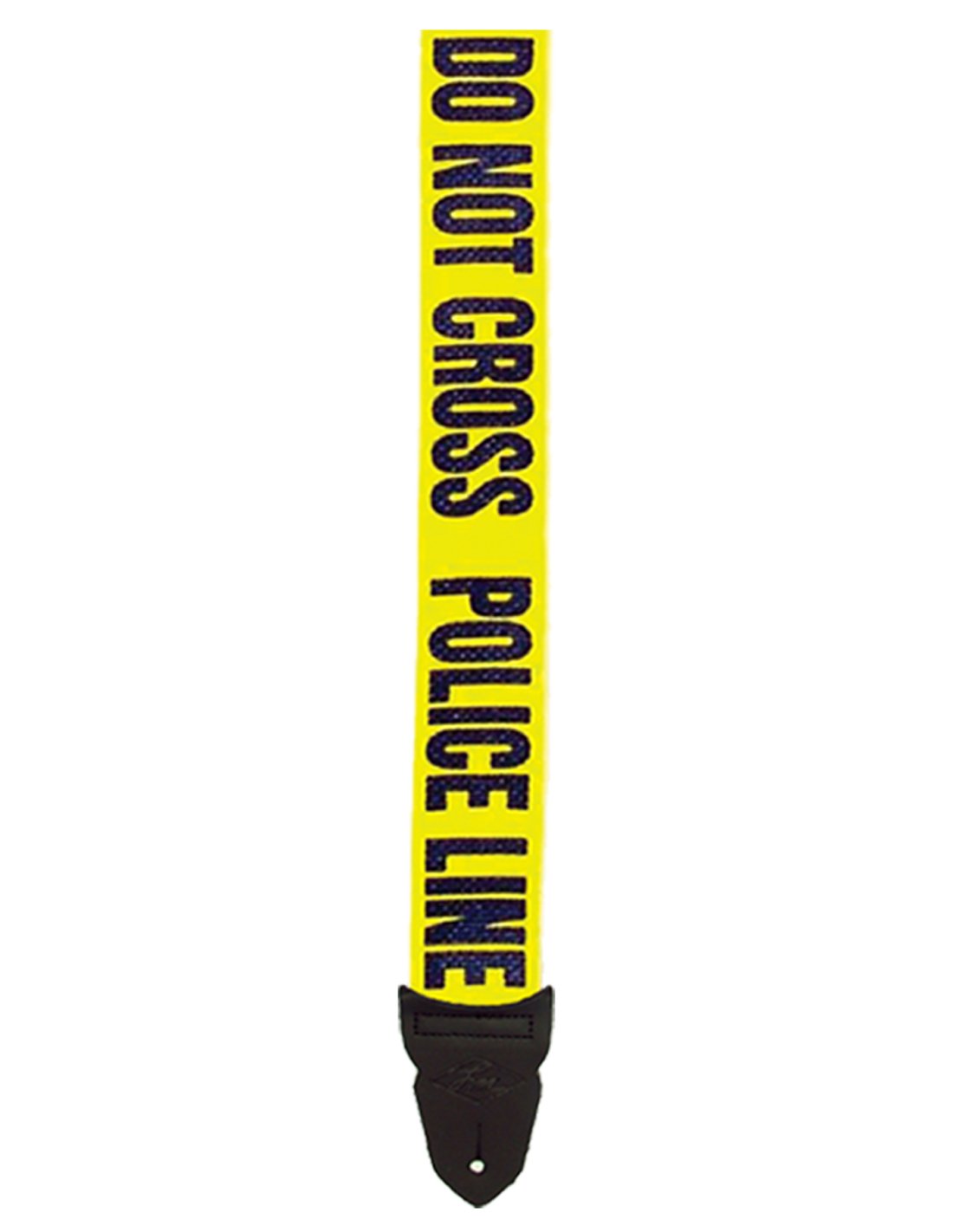 2” guitar strap with leather ends 2” polyester guitar strap with print, leather ends Main FeaturesLength: 60” Width: 2” Material: Polyester, Leather TerminalsPattern: Police Line
