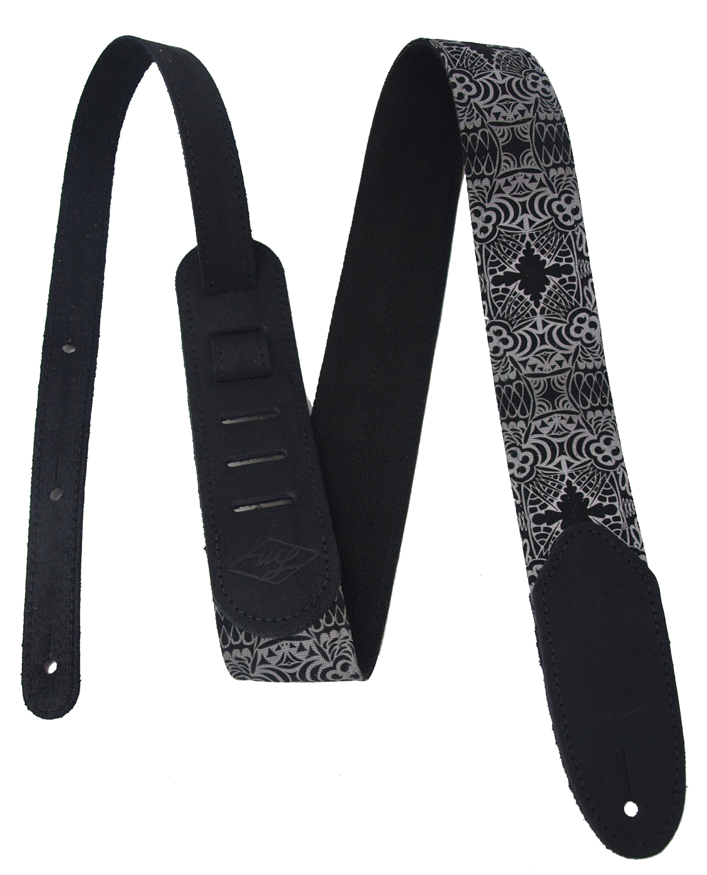 2” cotton guitar strap with genuine leather ends Cotton guitar strap with genuine leather ends Main FeaturesWidth: 2” Material. Printed cotton, leather ends Fantasy: 7