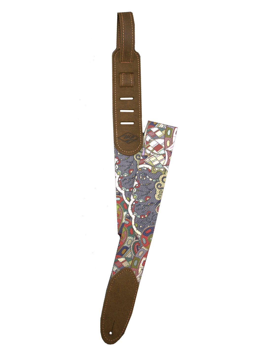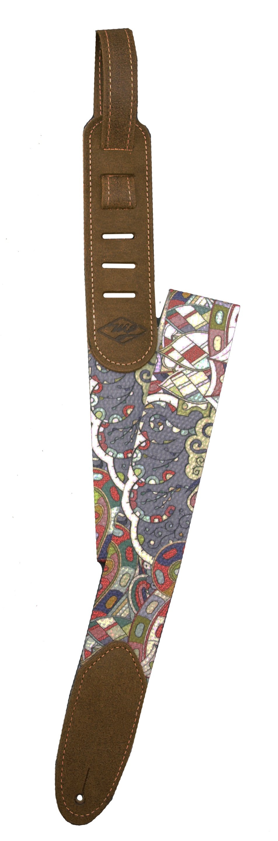 2” printed cotton guitar strap and leather ends 2” cotton guitar strap with direct print on the fabric and leather ends Main FeaturesLength: Adjustable 44” -58” Material: Cotton, Leather TerminalsColor: Purple