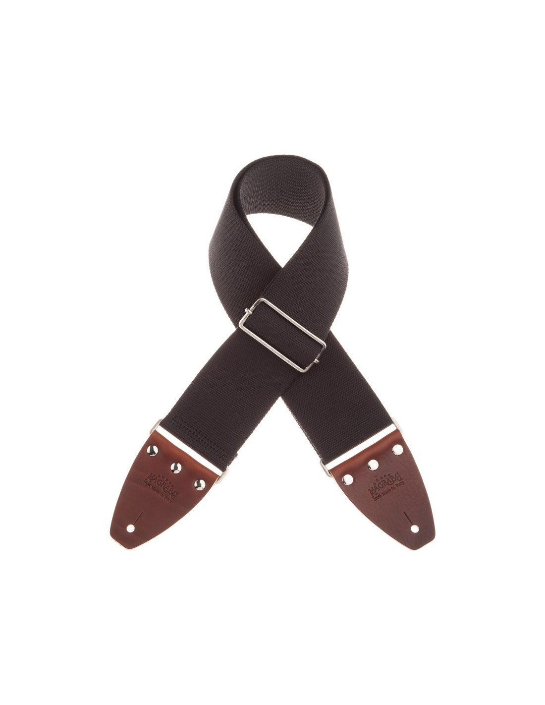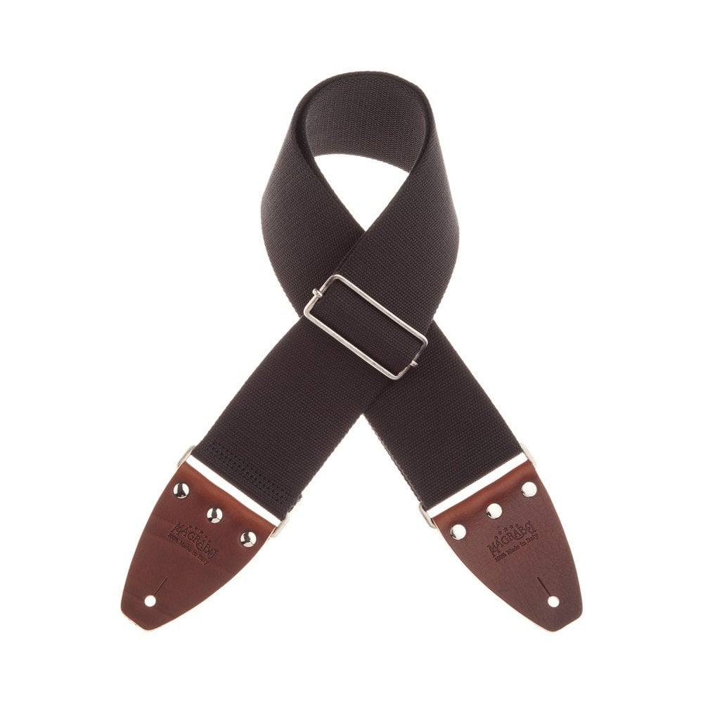 MAGRABO' STRIPE SC ENTRY BLACK 8 CM BROWN TERMINALS SILVER BUCKLE. Strap for guitar and electric bass made of high quality real cotton ribbon 100% Made in Italy, high-quality black genuine leather terminals, seamless, silver metal buckle, width 8 cm and adjustable length from 88 to 150 cm.