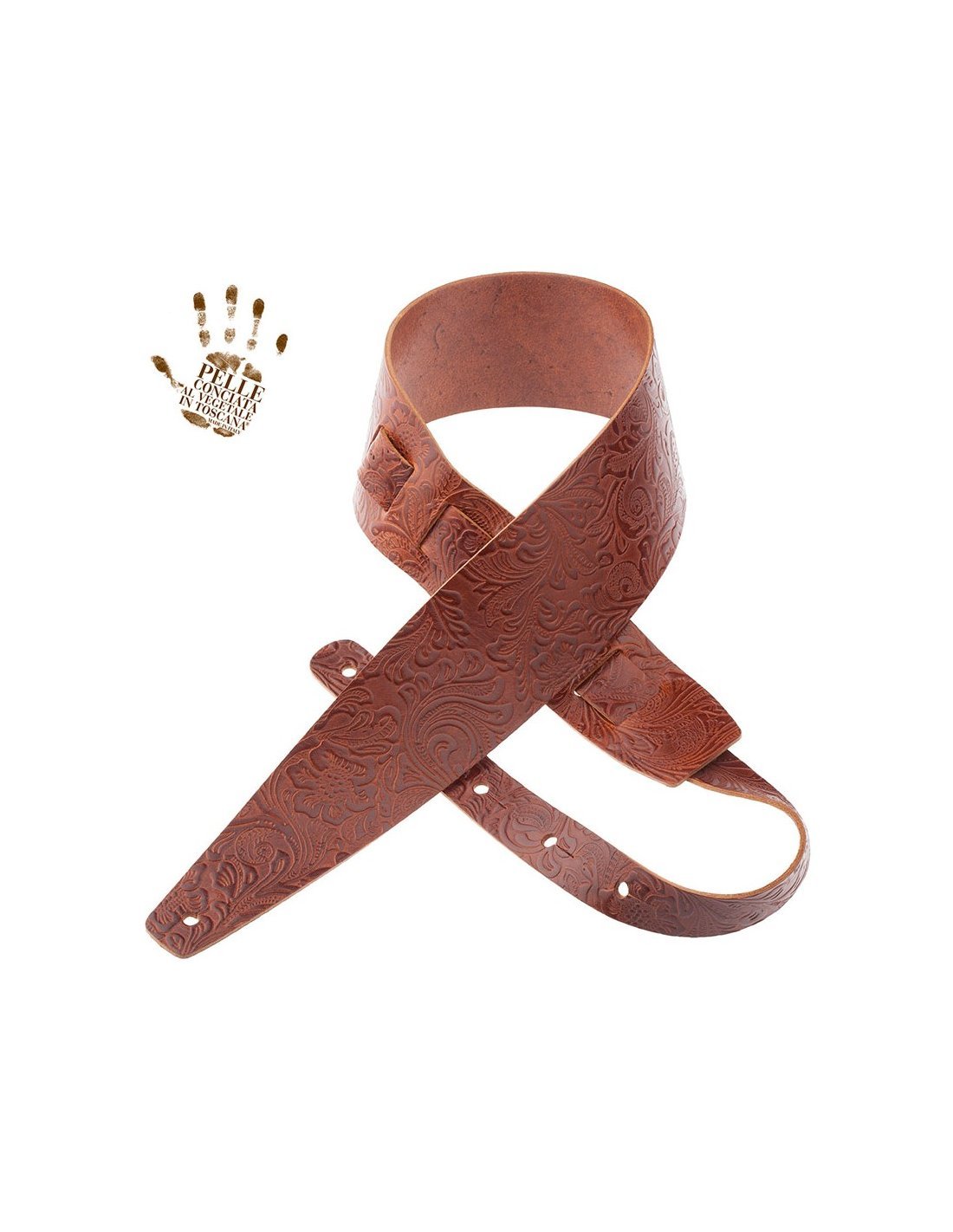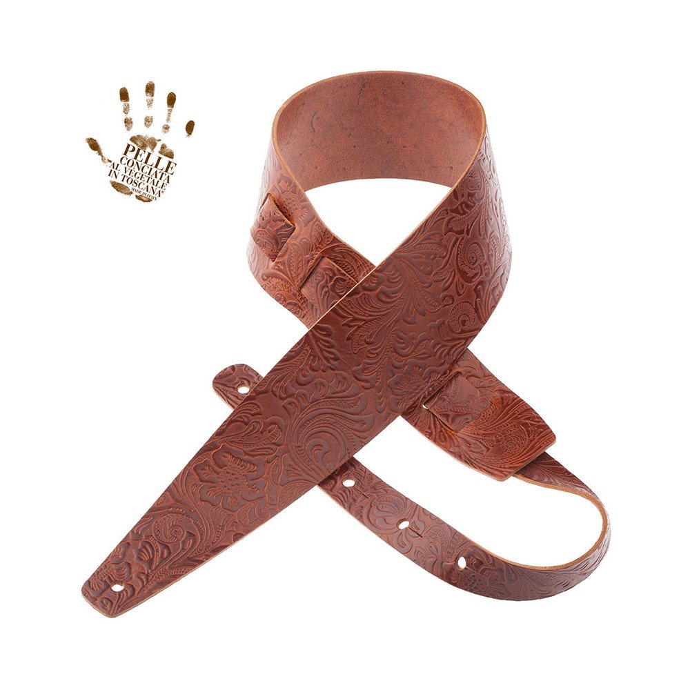 HOLES HS EMBOSSED FLORES BROWN 8 CM. Guitar and electric bass strap made of high quality genuine leather 100% Made in Italy, certified vegetable tanning, ecru stitching, suede inner lining, width 8 cm and adjustable length from 105 to 142 cm.