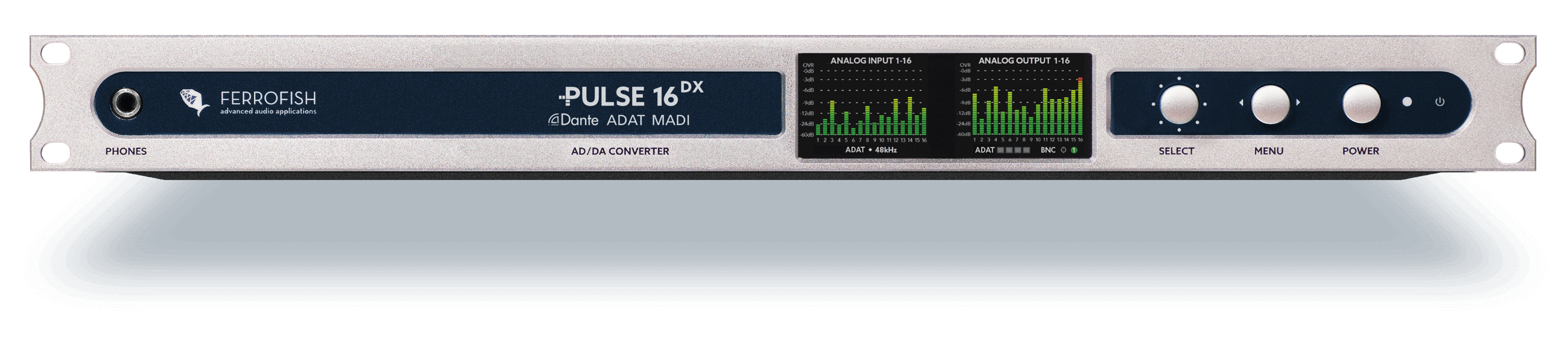 16-channel AD/DA converter, Dante, MADI and ADAT format - Multimode Like the Pulse16 MX, the Pulse16 DX offers 16 balanced inputs and outputs with ADA and MADI interfaces. In addition, the Pulse DX offers two RJ45 ports for integration into a DANTE system. This means not only that all 16×16 analog channels can be integrated into a DANTE network, but that the Pulse DX can also be used as a format converter between various digital formats (ADAT, MADI and DANTE) .Specifications:Cirrus Logic 24 Bit/192 kHz 16 x16 analog I/O channels DANTE (2 X RJ45 Dante) Optical MADI I/O (SFP module) MIDI Single or multimode operation via SFPWordClock I/O (BNC) Remote Control I/O Routing Matrix 2 x TFT screens allow complete control of all levels and settingsActive Jitter elimination circuitInput gain for all analog channels that can be set in steps of 1dB (from -8 dBu to +20 dBu) Output level for all analog channels that can be set in steps of 1dB (from -8 dBu to +20 dBu) Headphone outputWithout cooling fan19”, 1 RU