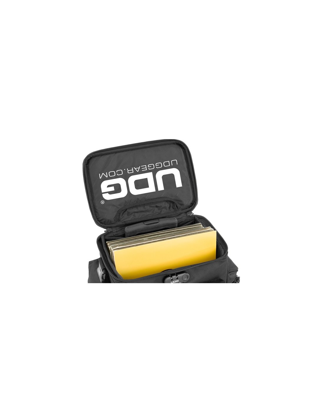 U9981BL/OR - DJ trolley - Semi-rigid and padded bag capable of holding laptops up to 13', a Vestax VCI 100 or Hercules RMX type controller, vinyl records, sound cards, Maschine Mikro/Classic MK2 headphones and accessories. EAN:8717228276316 Color: Black Weight: 6.30 kg/13.86 lbs External dimensions cm: 40 x 45.5 x 31 inch: 15.7 x 17.9 x 12.2 Internal dimensions cm: 31.5 x 32 x 20 inch: 12.4 x 12.6 x 7.9 Material: Water Resistant Nylon 420D Protection: Foam padded main compartment Extra's: Retractable handle with 3 stage internal trolley system. Large front pocket + 2 side pocket for Accessories and smaller gears. Comes with 2 CD Wallet 24. Smooth rolling in-line wheels . Integrated combination lock. UDG Headphone Bag can buckled up. Valid for: 60 LP's or 1 CD Wallet 128 + 1 CD Wallet 280 or 1 CD Wallet + CD Playerof MIDI Controller. Trolley fits up to 13' laptop. See description for details and check 'By Device'.