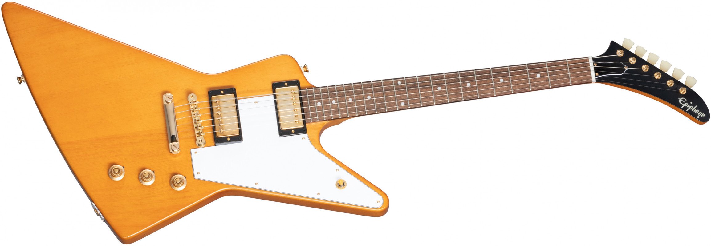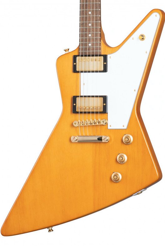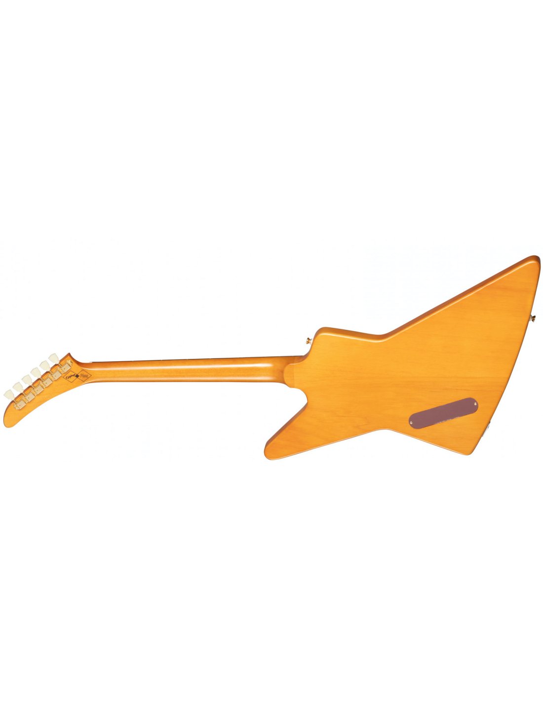 The EPIPHONE 1958 KORINA EXPLORER is a 6-string electric guitar. Technical features include: solid Korina handle. Keyboard with 12" radius, 22 Jumbo keys, Graph Tech nut. The electronics consist of 2 humbuckers: a Gibson Burstbucker™ 2 on the handle and 1 Gibson Burstbucker™ 3 on the bridge, CTS potentiometers, the controls are 2 for volume and 1 for tone, Mallory capacitors. ABR-1 Style bridge with LockTone Stop Bar string tensioners, Epiphone deluxe mechanics and gold hardware. Hard case included
