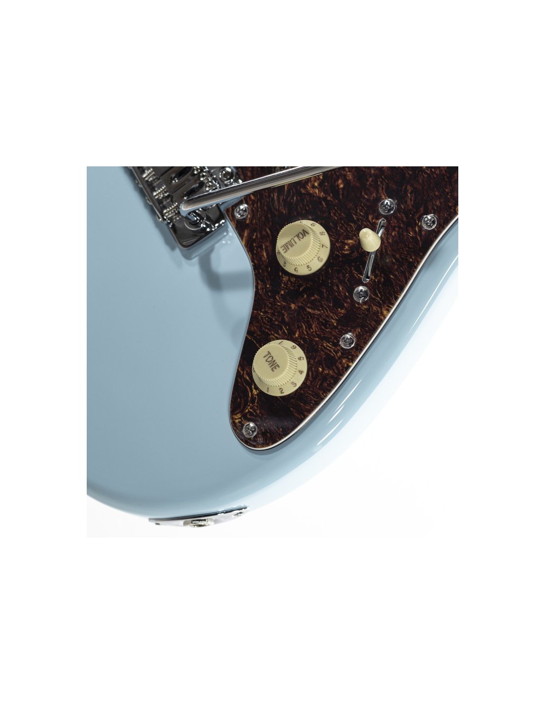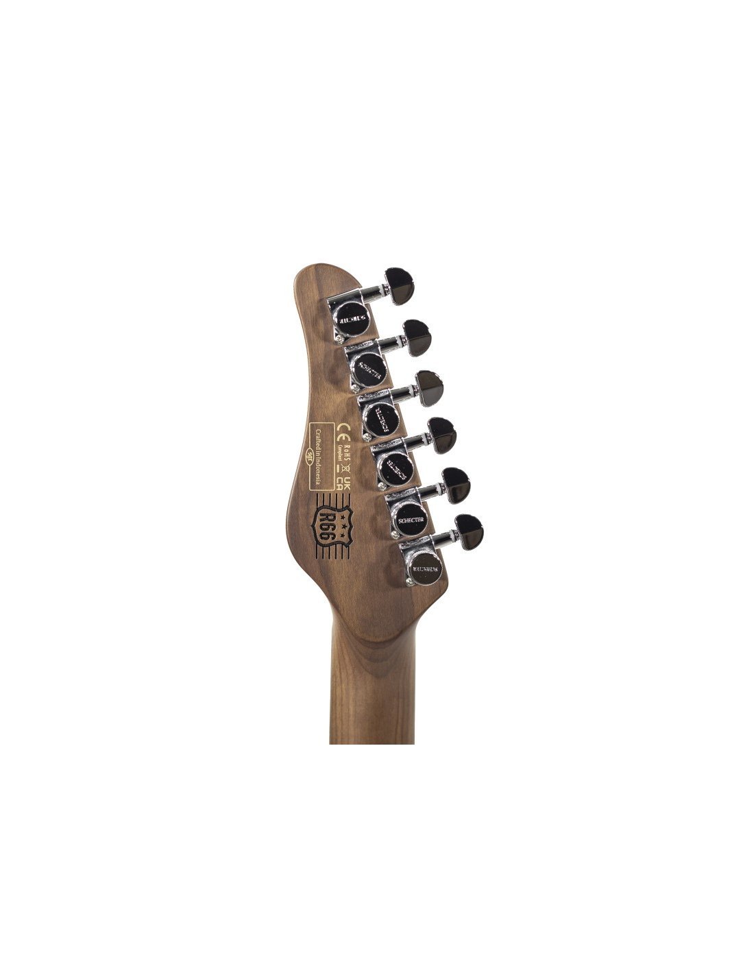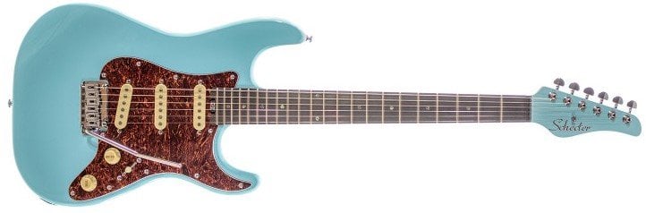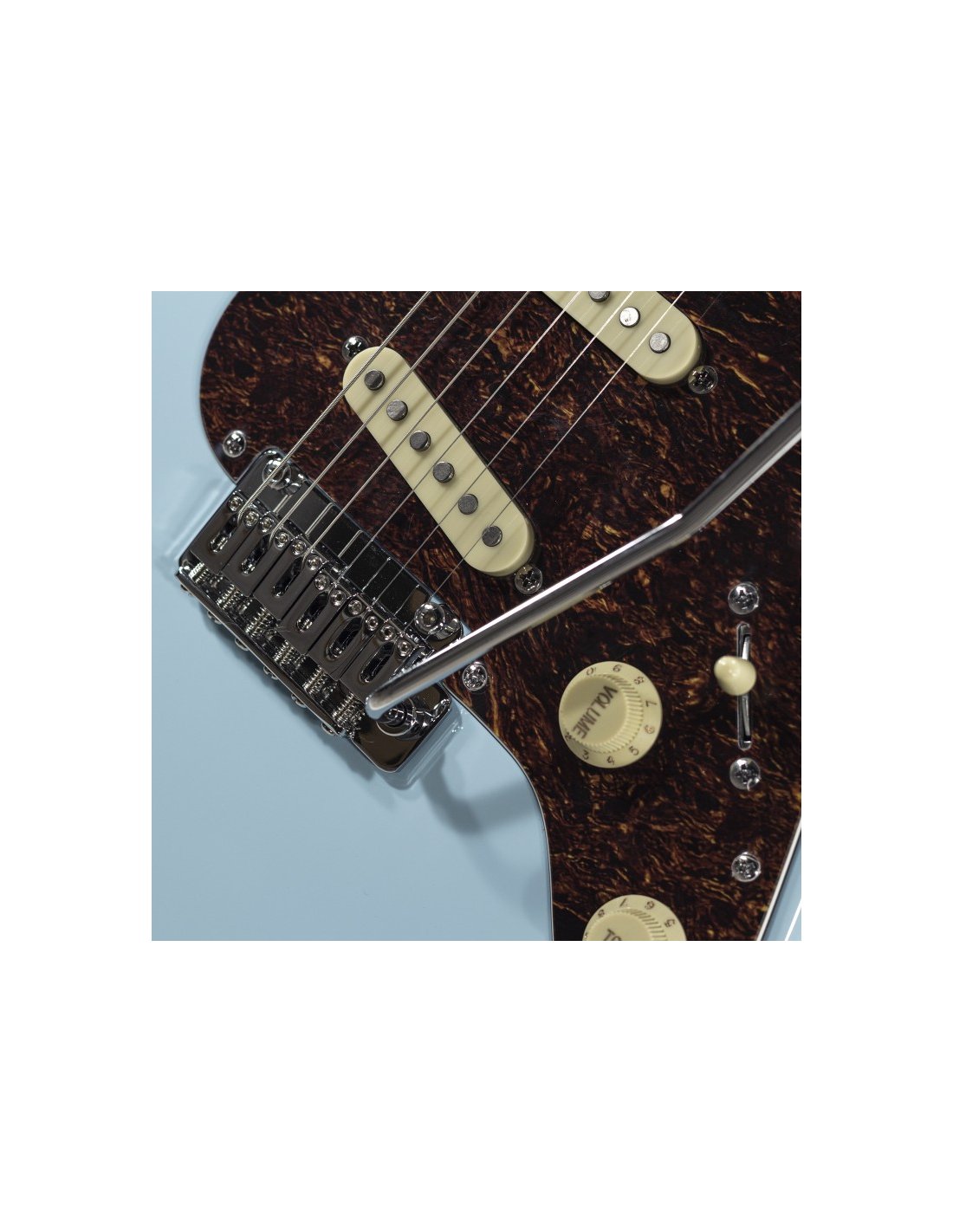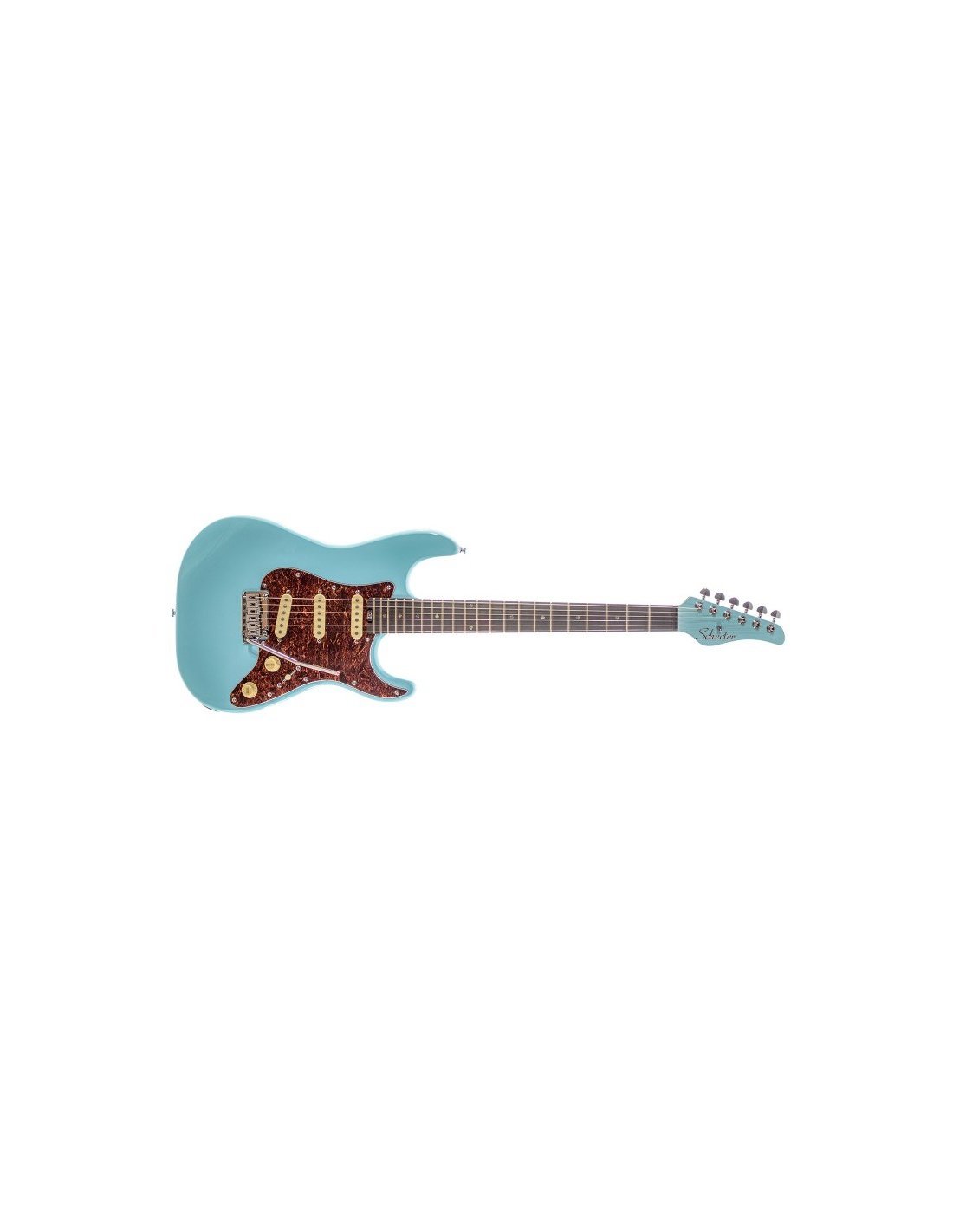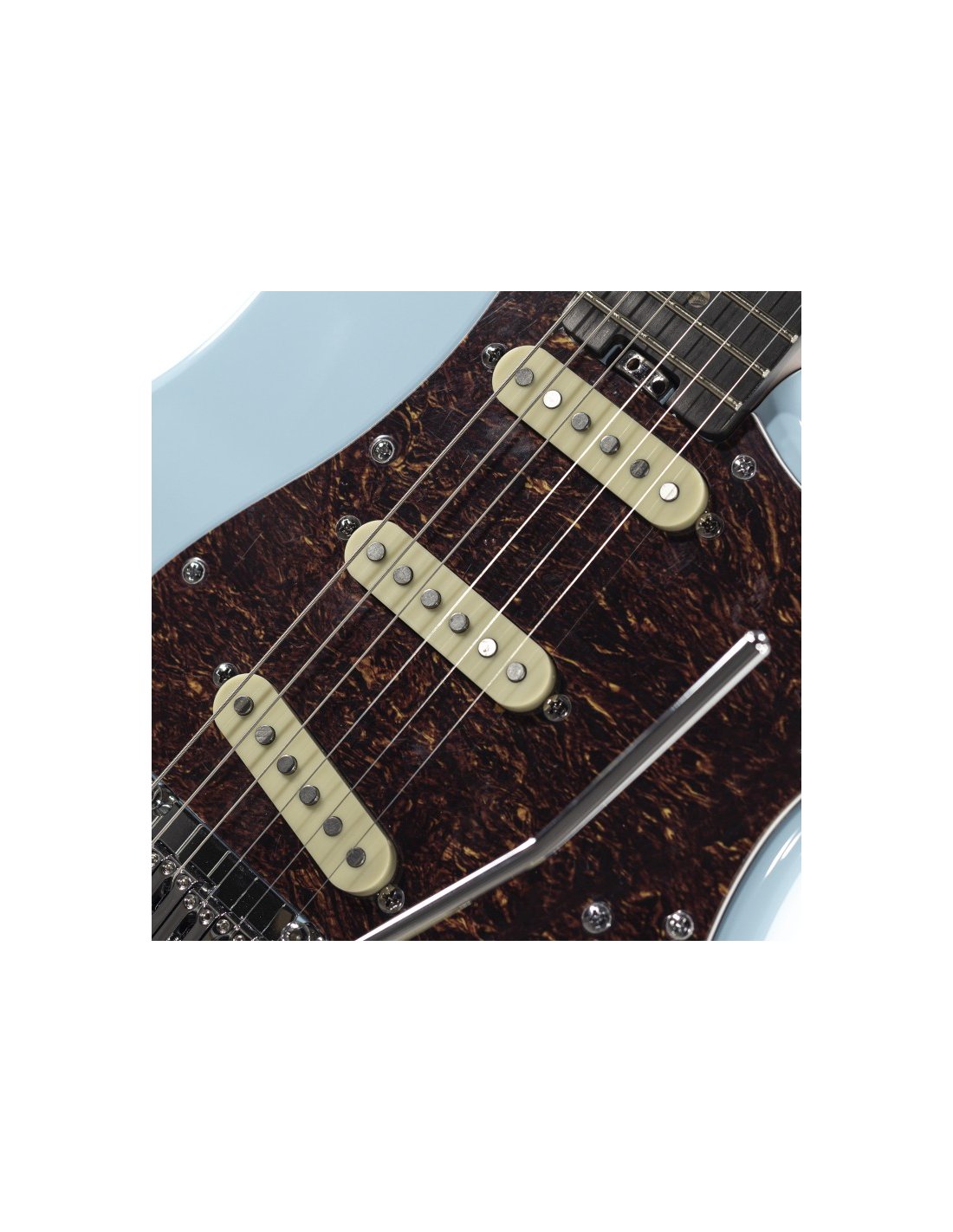 SCHECTER R66 VINTAGE TRADITIONAL SIXTIES electric guitar color Sonic Blue with matched headstock. Technical features include alder body, flamed maple top, roasted maple neck with ultra-thin C-profile, 14" rosewood fingerboard with 22 X-Jumbo frets, Schecter Diamond Vintage Tremolo bridge, SSS Pickup configuration with 3 Single Coil Schecter Pasadena Vintage VT-1 in the center and handle, self-locking Schecter