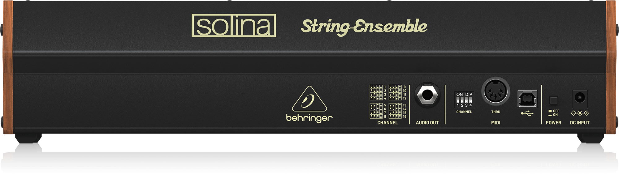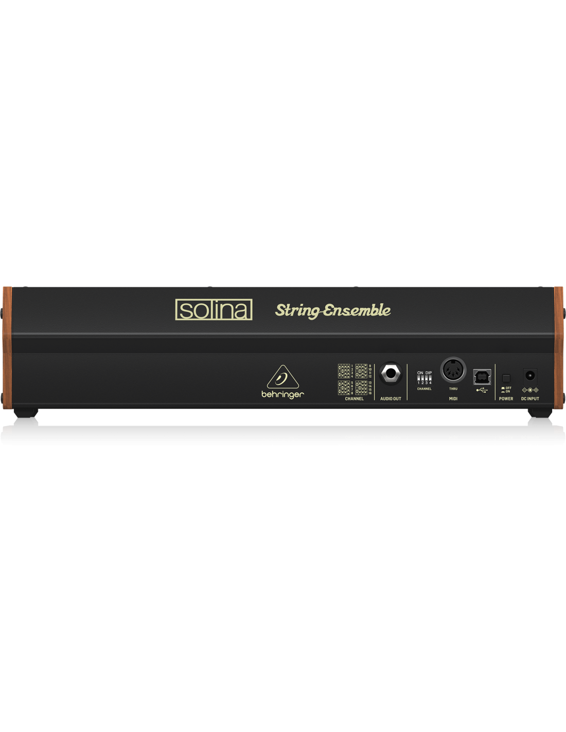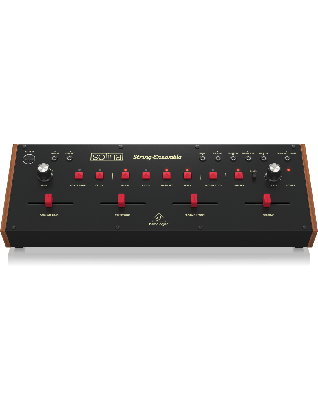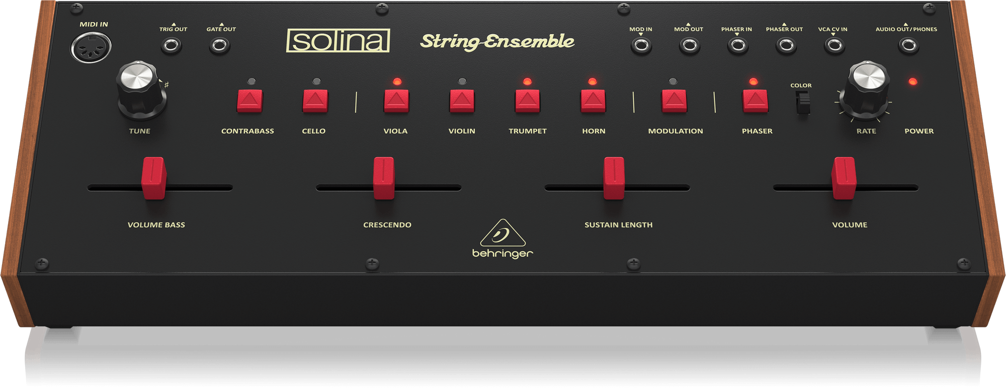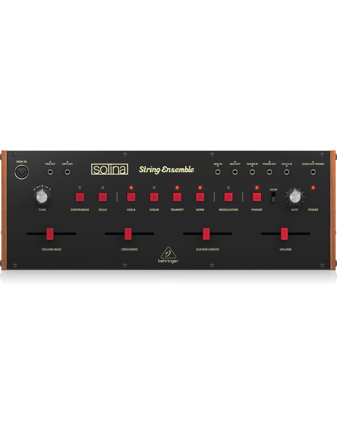BEHRINGER SOLINA STRING ENSEMBLE. Analog synthesizer by Ensamble di Archi, reproduction of the classic 70's ARP/Eminent Solina MK II synthesizer. Technical features include violin, viola, trumpet, horn, cello and double bass sounds, tuning controls, crescents, sustain, volume and bass level, Bucket Brigade (BBD) chorus ensemble effect, 13-tone generator with octave division technology to provide 49-voice