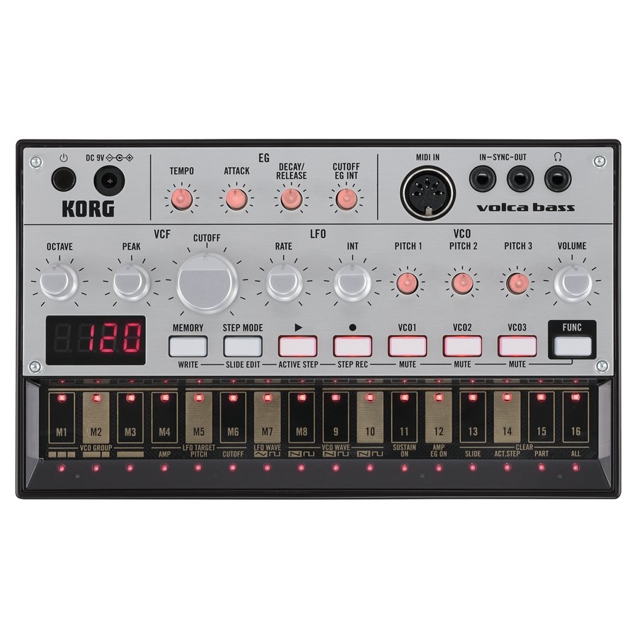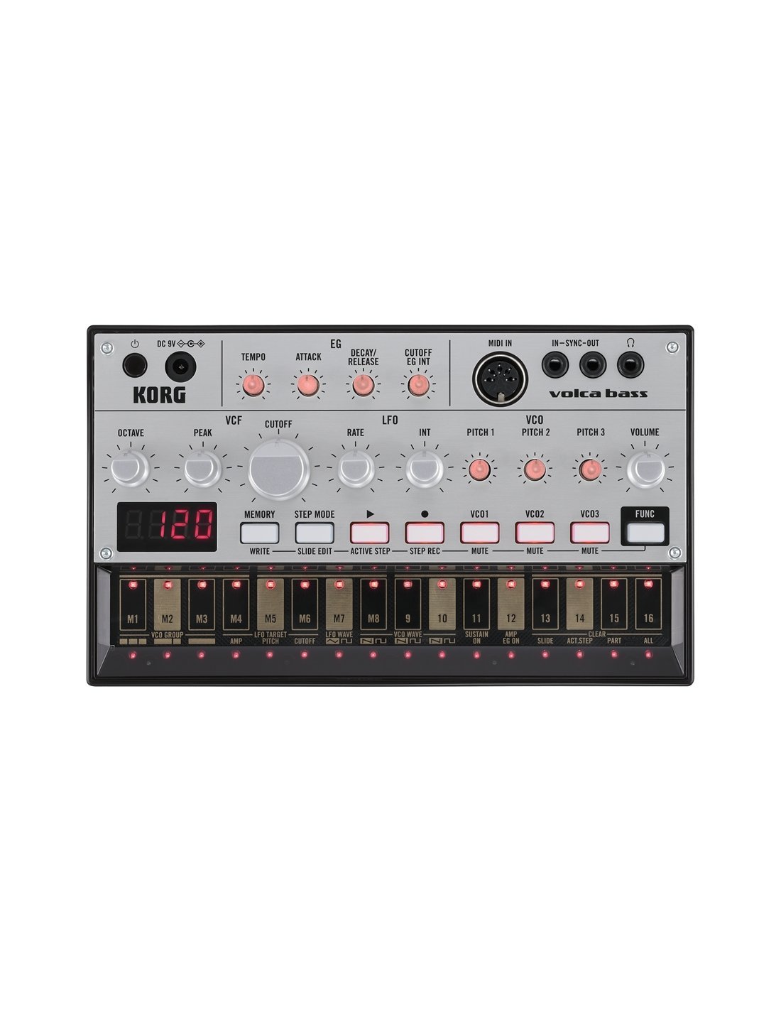 KORG VOLCA BASS is an analog Bass Synth with 16-step Sequencer, 3 oscillators, 1 Envelope Generator, 1 newly designed filter, 1 VCA and 1 LFO, resonance control and distortion