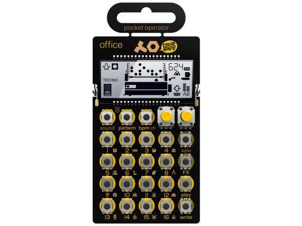TEENAGE ENGINEERING PO 24 OFFICE is a pocket drum machine and percussion synthesizer with a 16-step Step Sequencer, LCD display, parameter lock, solo functionality, 16 punch in effects, 16 sounds and a Jam Sync function for synchronizing with other Pocket Operators.