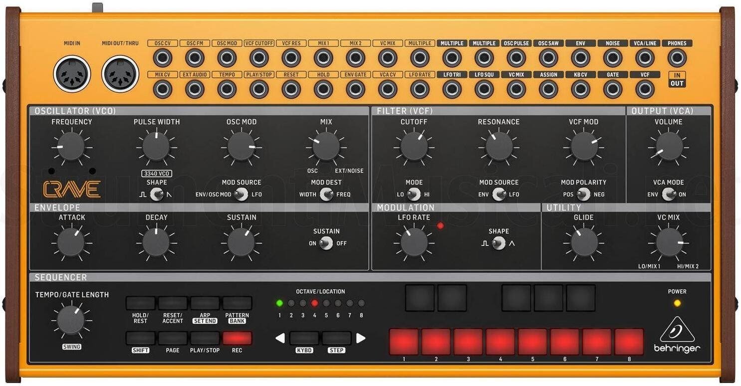 BEHRINGER CRAVE is a semi-modular analog synthesizer with VCO, VCF, Envelope Generator and Sequencer. It has an oscillator (VCO) with pulse or sawtooth waveform selector, with Frequency, Pulse width, Osc mod and Mix control commands. The VCF section has a Cutoff command with a pass/low-pass/high-pass filter selection switch, Resonance command and VCF mod with a Mod polarity selection switch for positive or negative signal polarity. The VCA output has a volume knob and mode selection switch. The envelope generator has the Attack, decay and sustain commands with On/off switch, while the 32-step sequencer has 64