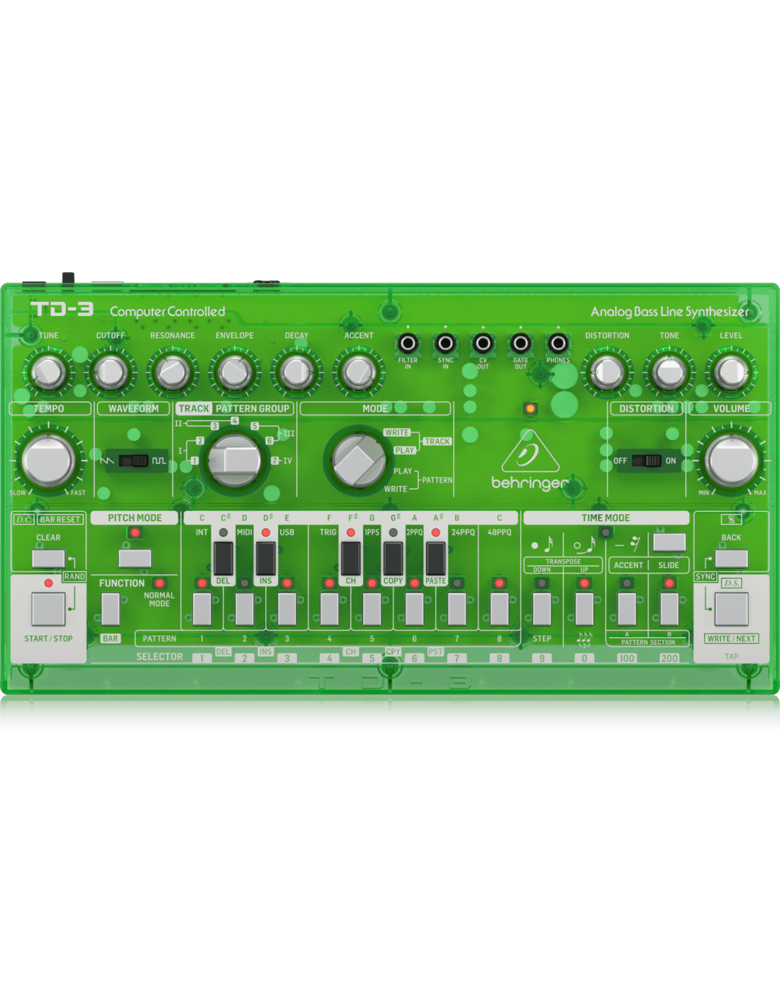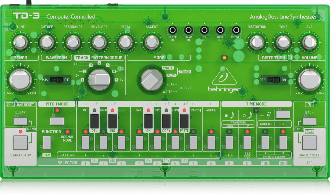 BEHRINGER TD-3-LM. Analog bass synth with sequencer, arpeggiator and resonant VCF. Technical features include analog VCO with selectable sawtooth or square waveforms, 4-pole resonant VCF filter, sequencer with 16 steps, 7 tracks and 250 memorizable patterns. It has a Poly chain output to connect the device to other modules, and can be connected to any DAW via 5-pin DIN and USB/MIDI output