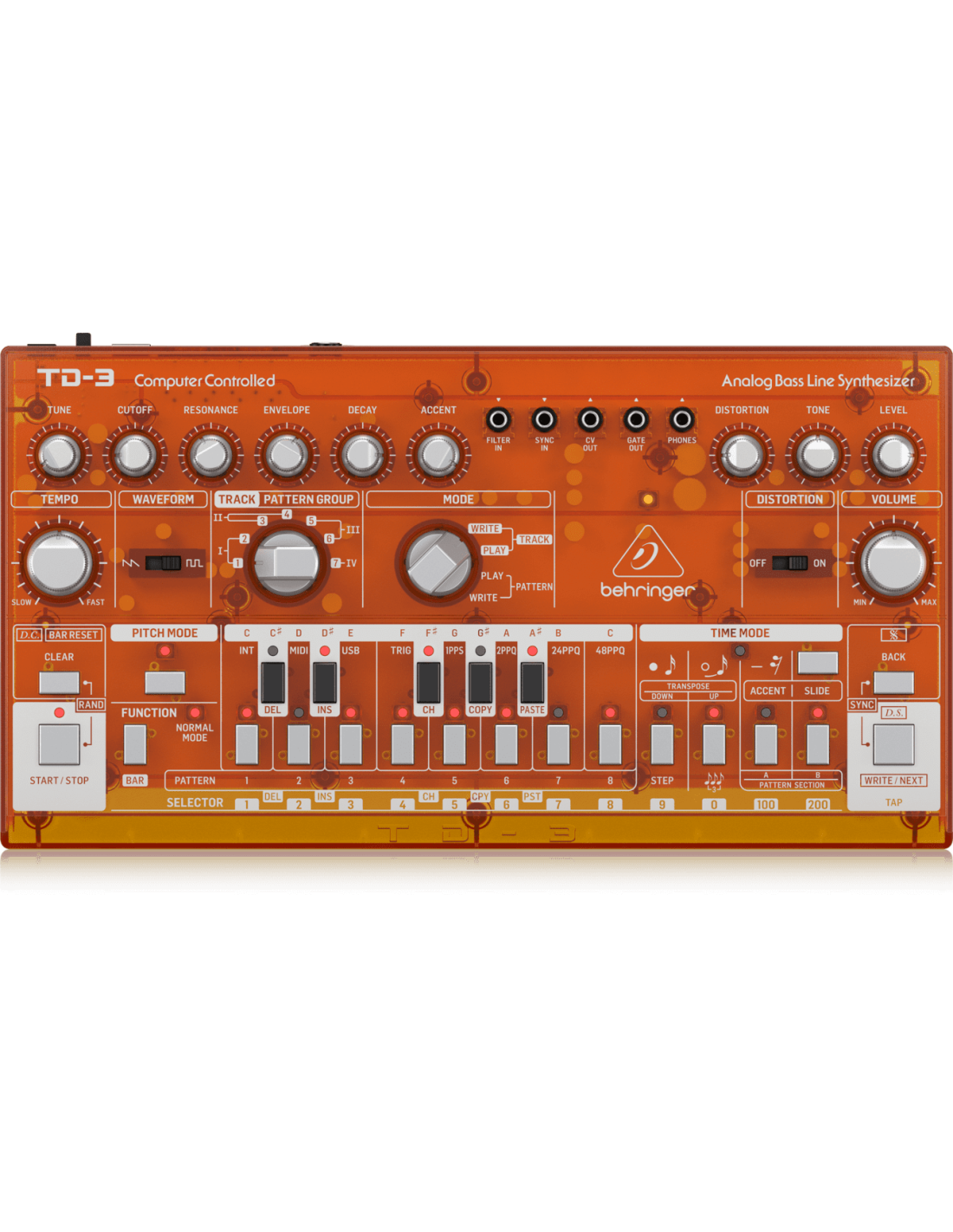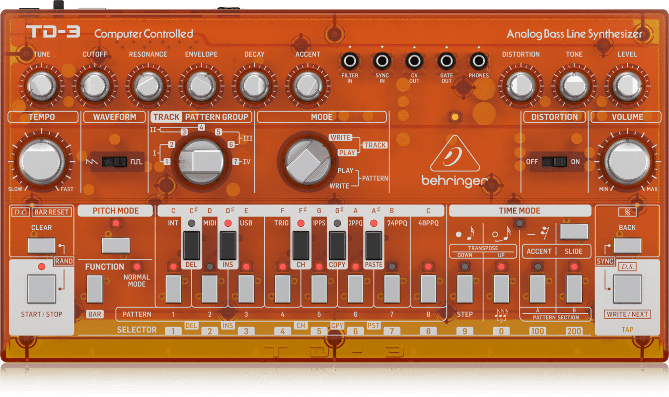 BEHRINGER TD-3-TG. Analog bass synth with sequencer, arpeggiator and resonant VCF. Technical features include analog VCO with selectable sawtooth or square waveforms, 4-pole resonant VCF filter, sequencer with 16 steps, 7 tracks and 250 memorizable patterns. It has a Poly chain output to connect the device to other modules, and can be connected to any DAW via 5-pin DIN and USB/MIDI output