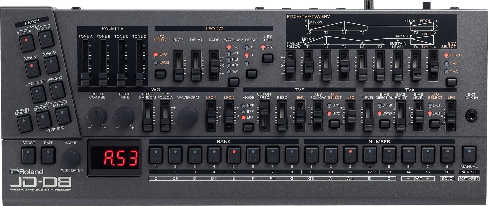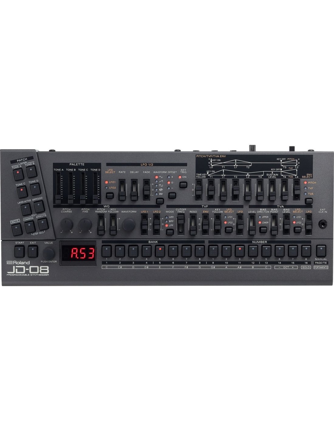 The JD-08 is a Roland synthesizer that reproduces, in a compact version, a famous digital synth from the 90s. It is equipped with 64 original presets plus 21 new presets, 108 original waveforms, a two-part, 64-step polyphonic sequencer, and an audio/MIDI interface via USB-C.