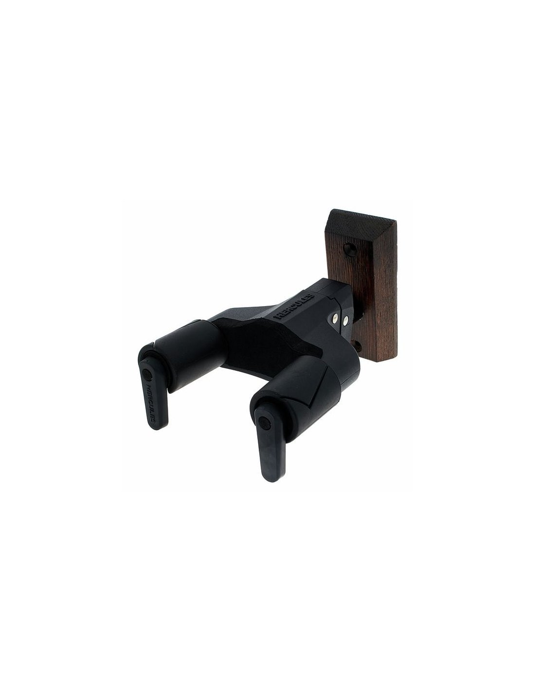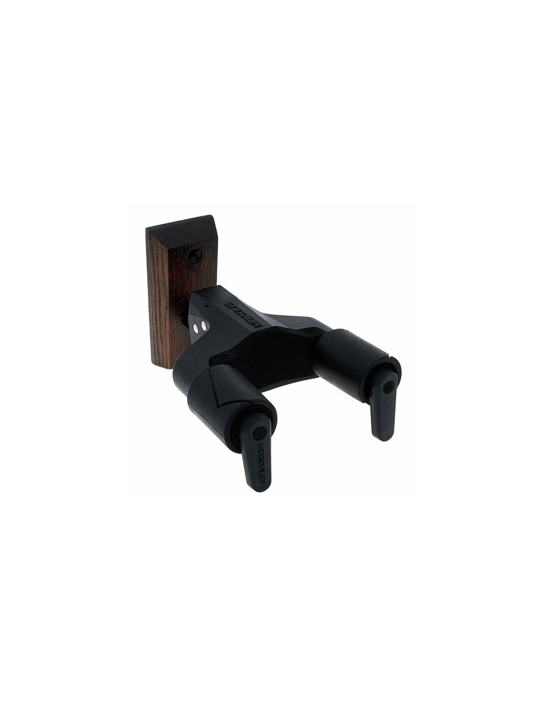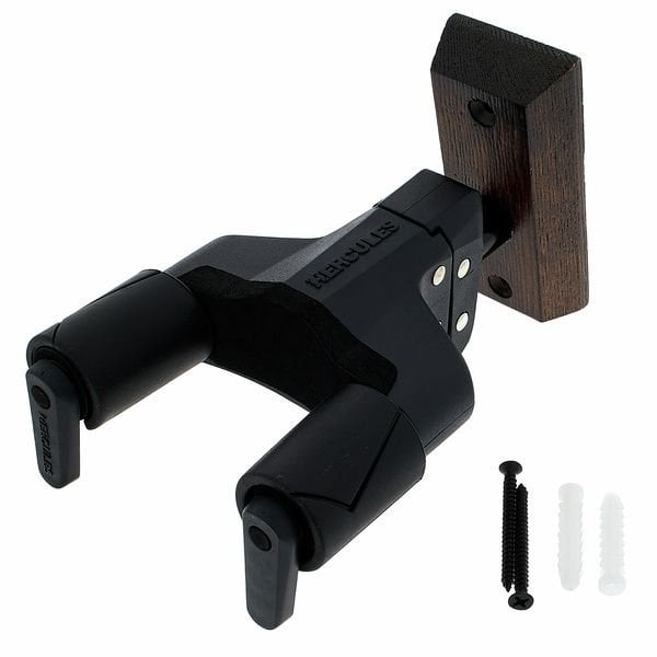 HERCULES GSP 38WBW PLUS is a guitar wall stand with dark brown wooden base, AutoSwivel AGS Plus bracket for multi-angle adjustments and secure locking of the instrument thanks to the Auto-Grip system, soft sponge coating for the parts in contact with the instrument, maximum load 7Kg.