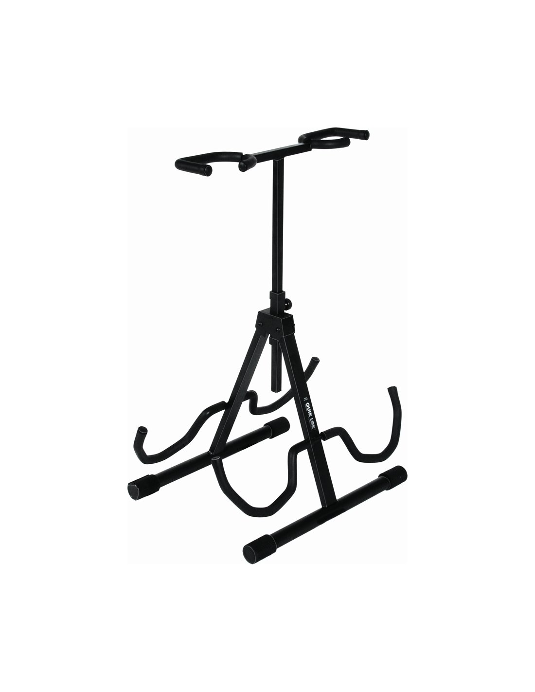 Double universal stand for electric and acoustic guitars with height-adjustable neck support The lower part of the holders is designed to fit acoustic and electric