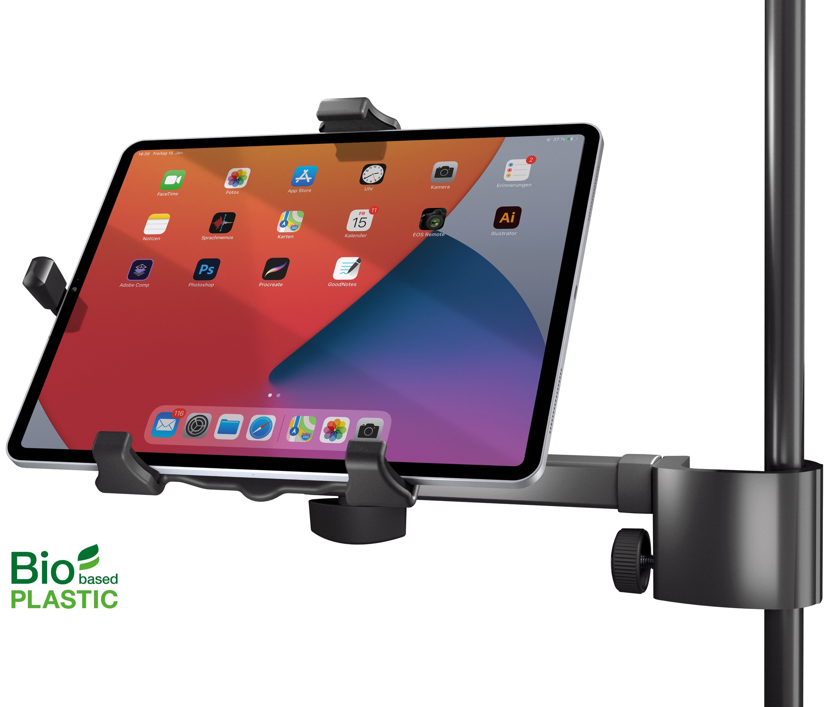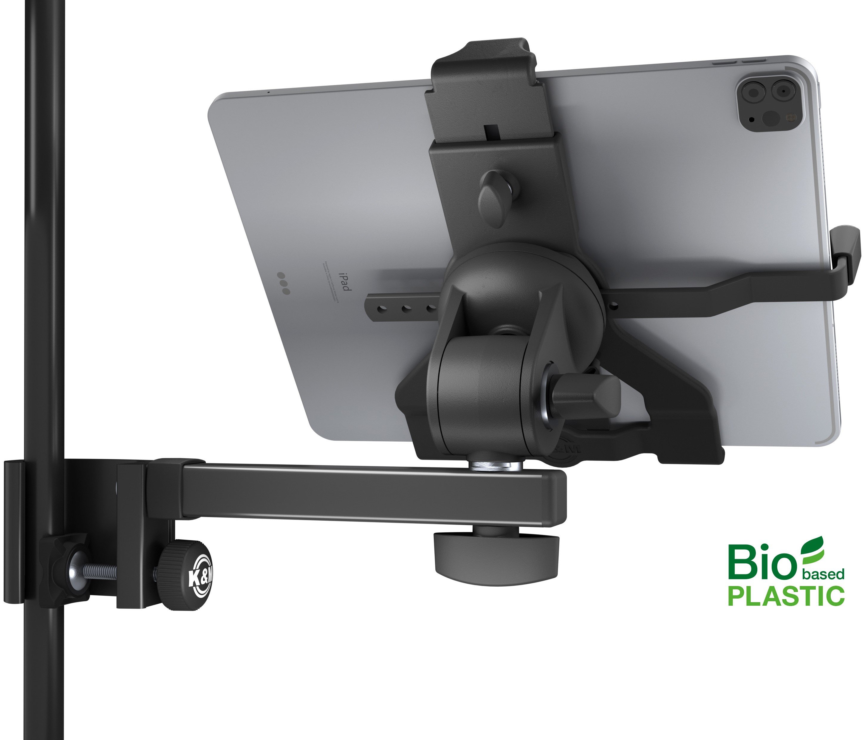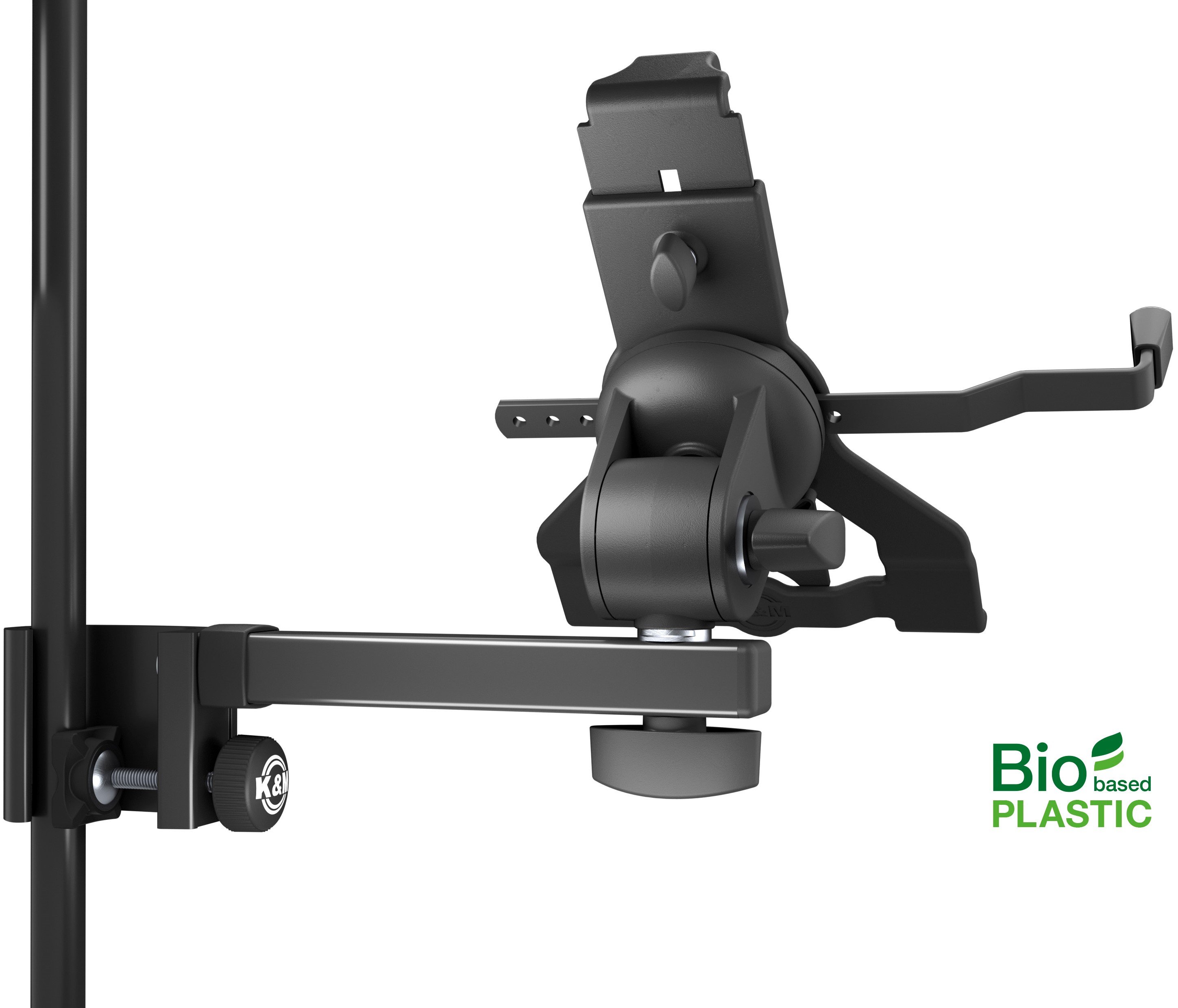 K&M 19743-000-55 TABLET-PC HOLDER. Universal holder for tablets and PCs that can be mounted on a rod with a practical locking mechanism, for all tablets and PCs from 10" to 16"