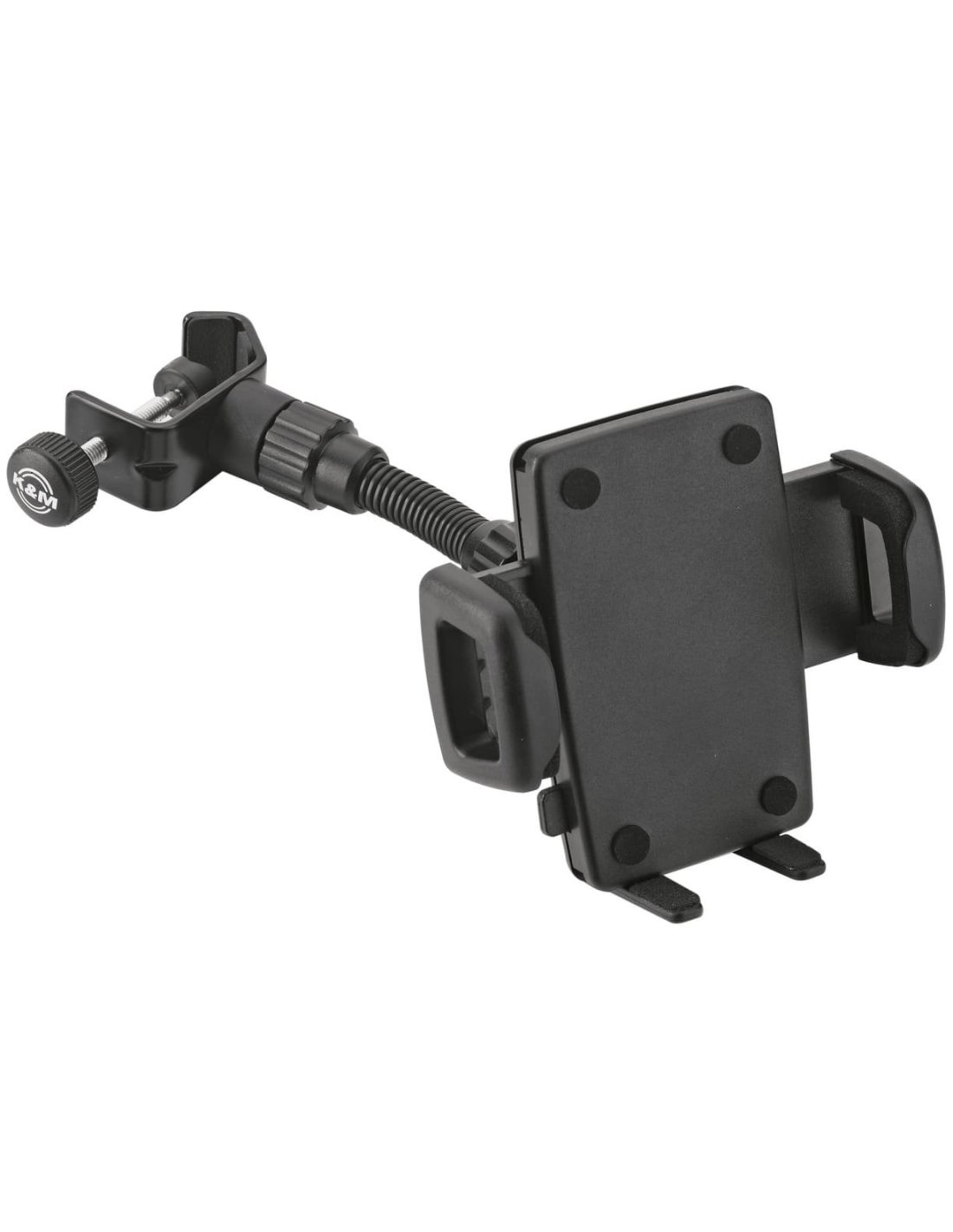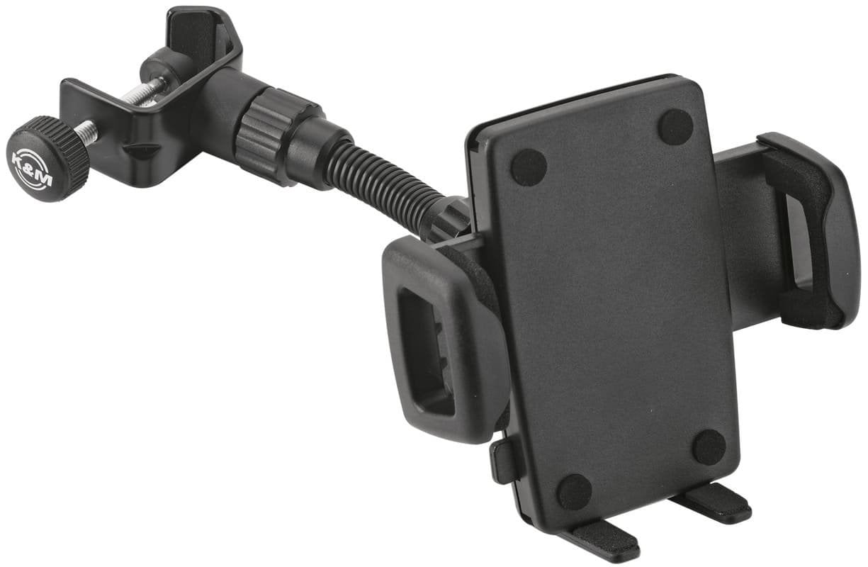 K&M 19747-000-55 SMARTPHONE HOLDER. Universal smartphone holder for rod with locking jaws to better adjust the width of the device, rubber-coated plate and jaws, jaw release button, ball joint for maximum adjustment, flexible support arm. Mountable on any rod up to 30mm in diameter.