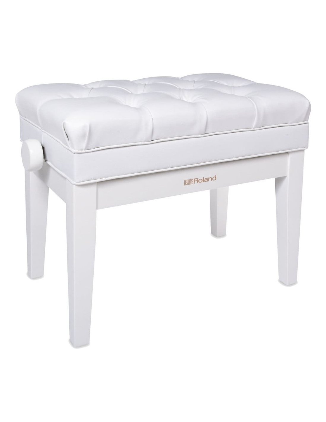 The RPB-500PW is a glossy white Roland piano bench. It is equipped with a solid wood structure, padded seat with imitation leather upholstery, compartment for objects, steel mechanics and knobs