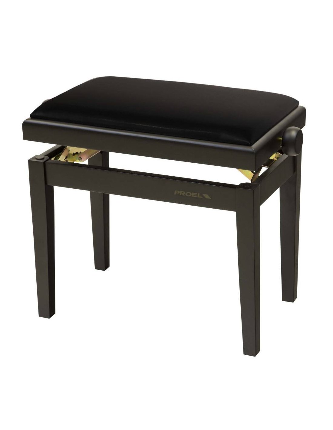 The PB90VSBBK is a professional piano bench by Proel in matt black. It is equipped with a wooden frame, padded seat with velvet upholstery, steel mechanism and knobs for adjusting the height