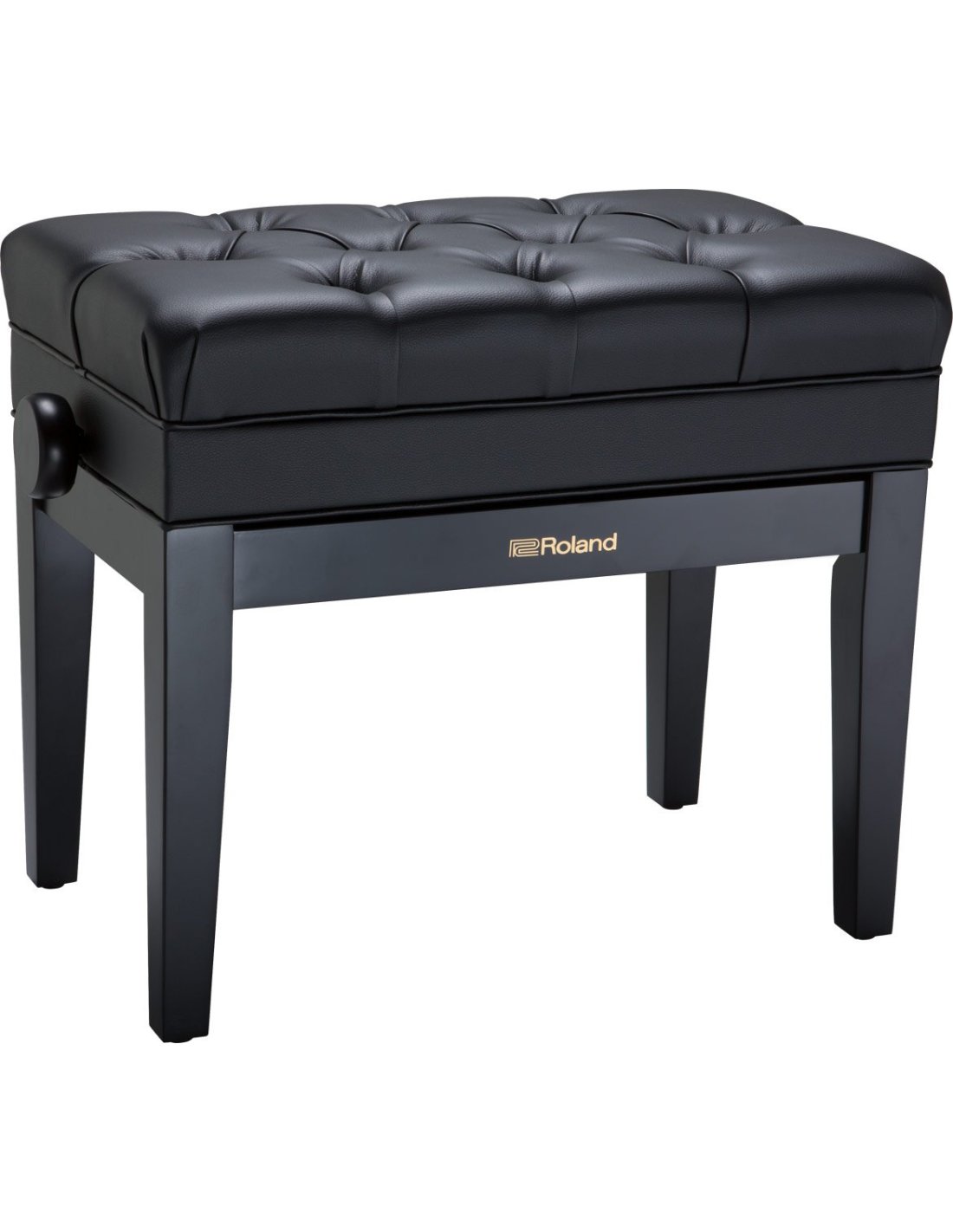 The RPB-500PE is a glossy black Roland piano bench. It is equipped with a solid wood structure, padded seat with imitation leather upholstery, compartment for objects, steel mechanics and knobs