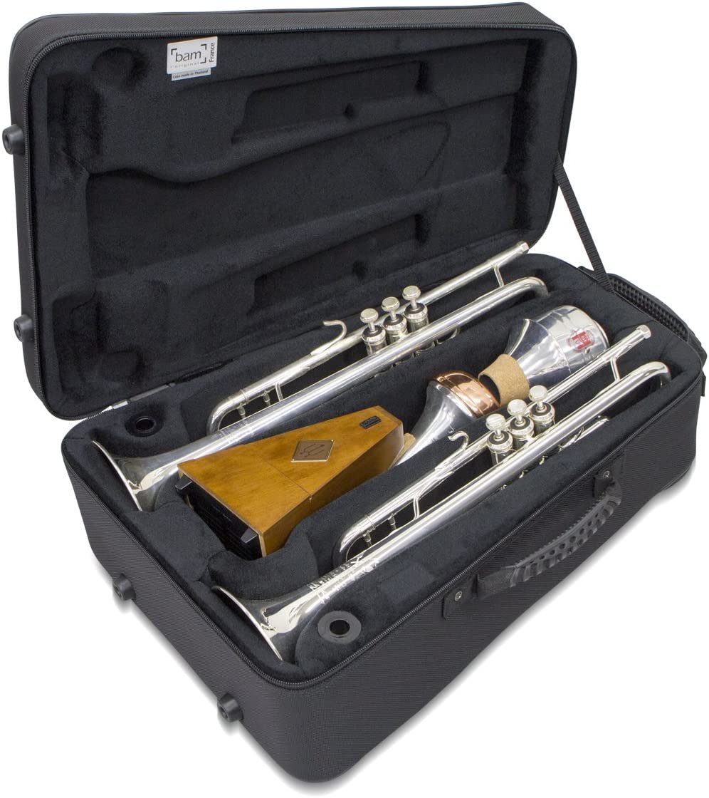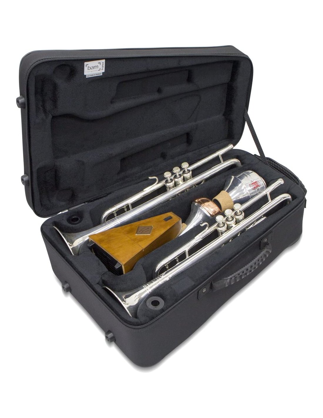 TREK3024SC Case for 2 trumpets with bell 13 cm Internal part in high density polyurethane foam, which protects the instrument from thermal shocks Accessory compartment 1000 denier cordura fabric water resistant 2 retractable padded shoulder straps Side handle With comfortable zipper Large expandable external pocket for sheet music Additional external rain cover External dimensions: 56x28x28 cm Internal dimensions: length 49 cm Weight: 3.3 kg Color: Black Carbon