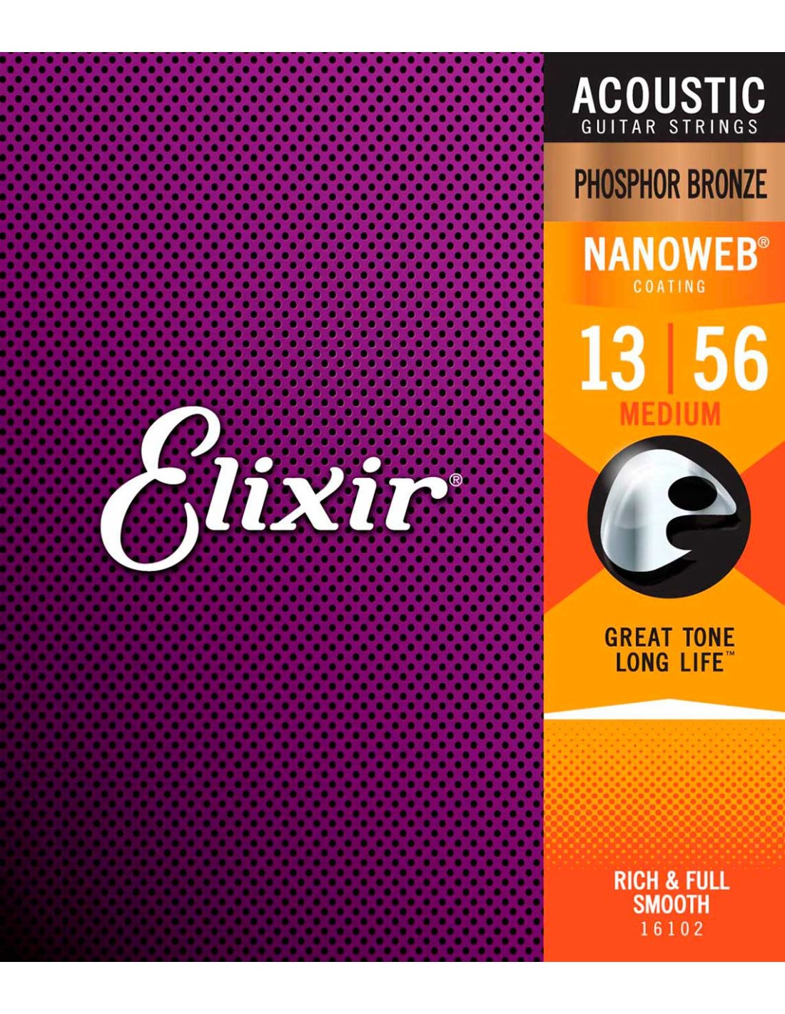 Elixir 16102 Phosphor Bronze Medium 13-56 Acoustic Guitar Strings. The Elixir 16102 Phosphor Bronze Medium 13-56 are a set of strings for acoustic guitar, phosphor bronze, with Nanoweb coating and medium scaling .013 .017 .026w .035w .045w .056w