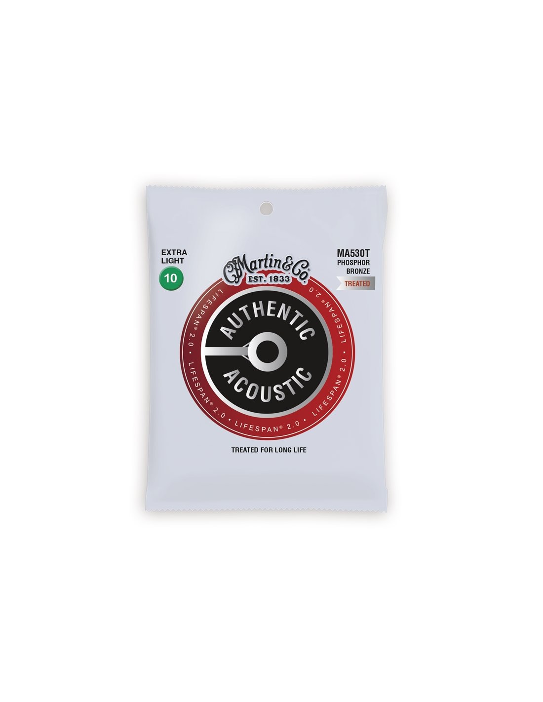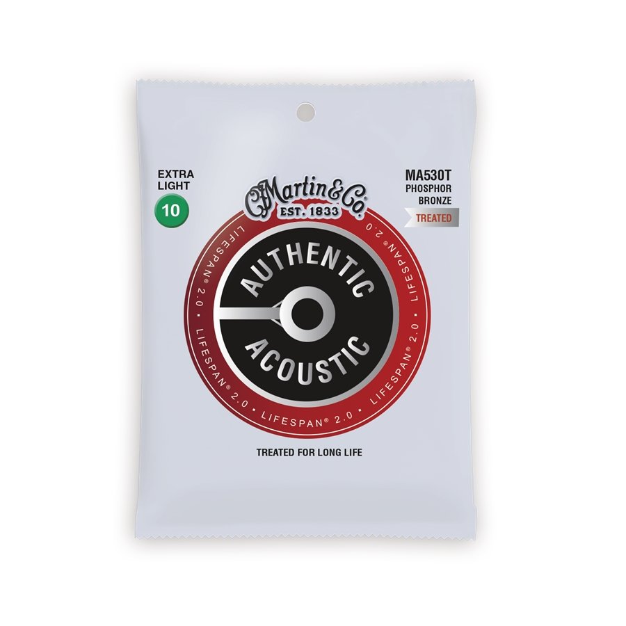 Martin MA530T Treated Authentic Extra Light Ph/Bronze 10/47 Acoustic Guitar Strings. The Martin MA530T Treated Authentic Extra Light Ph/Bronze 10/47 are a set of phosphor bronze acoustic guitar strings with extra light scaling .010 .014 .023w .030w .039w .047w that use a new method designed to protect the central wire and the external winding, preventing