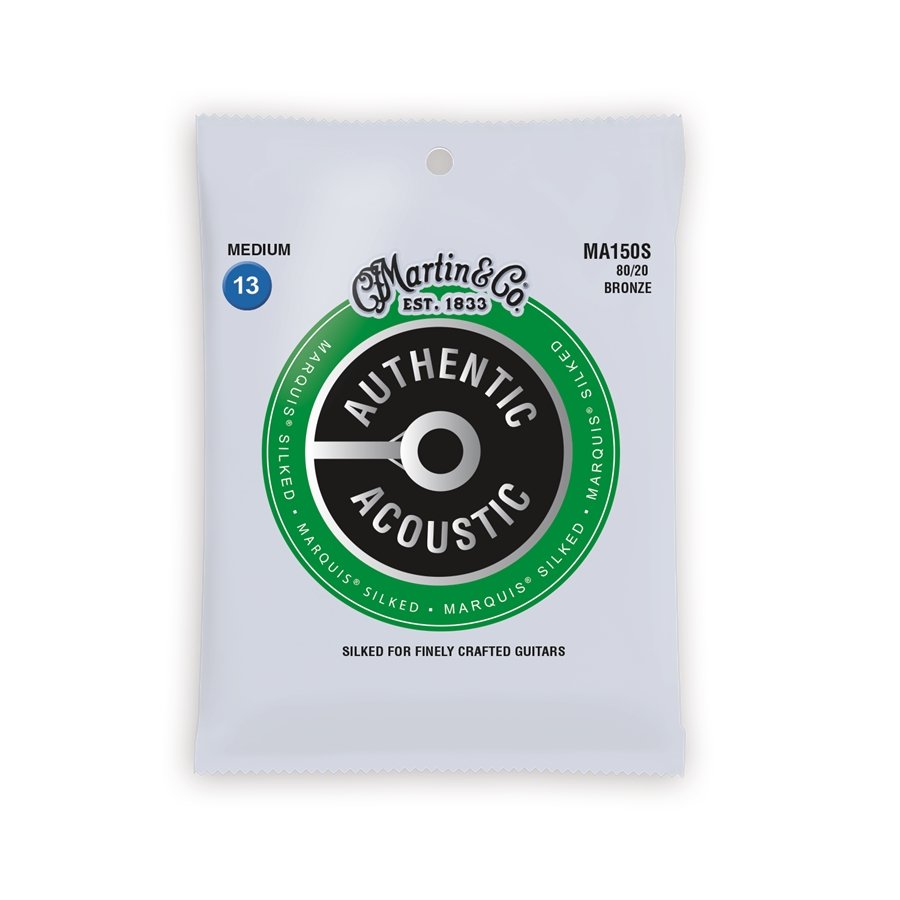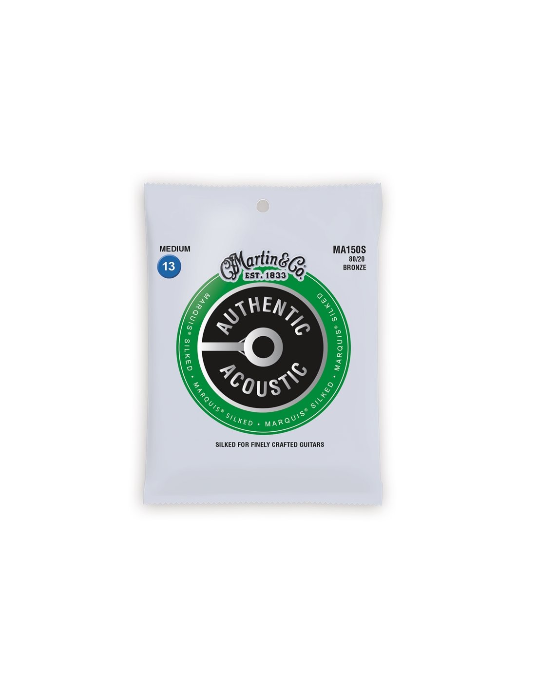 Martin & Co's MA150S acoustic guitar strings from the Authentic Acoustic Marquis® Silked series are the strings that, thanks to the soft silk coating positioned at the level of the lug, offer extra protection by limiting bridge wear. Long-lived, balanced and corrosion-resistant, they guarantee a genuine tone, tuning stability and great playability. MA150S in Medium scale with 80/20 Bronze wrap, have the following diameters: 13-17-26-35-45-56