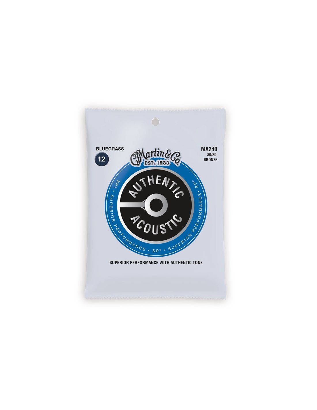 Martin & Co's MA240 acoustic guitar strings from the Authentic Acoustic SP® series are composed of a high-quality 80/20 Bronze wound on wire that is ultra resistant to traction and corrosion. They offer a genuine and balanced tone, tuning stability and great playability. MA240 in Bluegrass scaling have the following diameters: 12-16-25-35-45-56