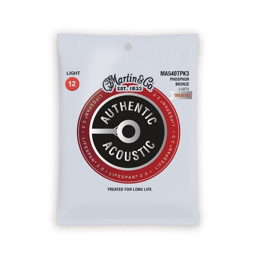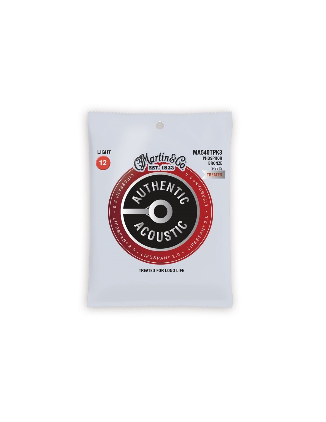 Martin & Co's MA540T acoustic guitar strings from the Authentic Acoustic Lifespan® 2.0 series are the strings that use a new technology patented by Martin after two years of research and experimentation. A new method designed to protect the central wire and the external winding, preventing corrosion without compromising the timbre of your instrument. The Lifespan® 2.0 series strings provide a smooth tactile experience by reducing friction between fingers and string. Ultra-durable and balanced, they guarantee a genuine tone, tuning stability and great playability. MA540T in Light scaling with Phosphor Bronze wrap, have the following diameters: 12-16-25-32-42-54