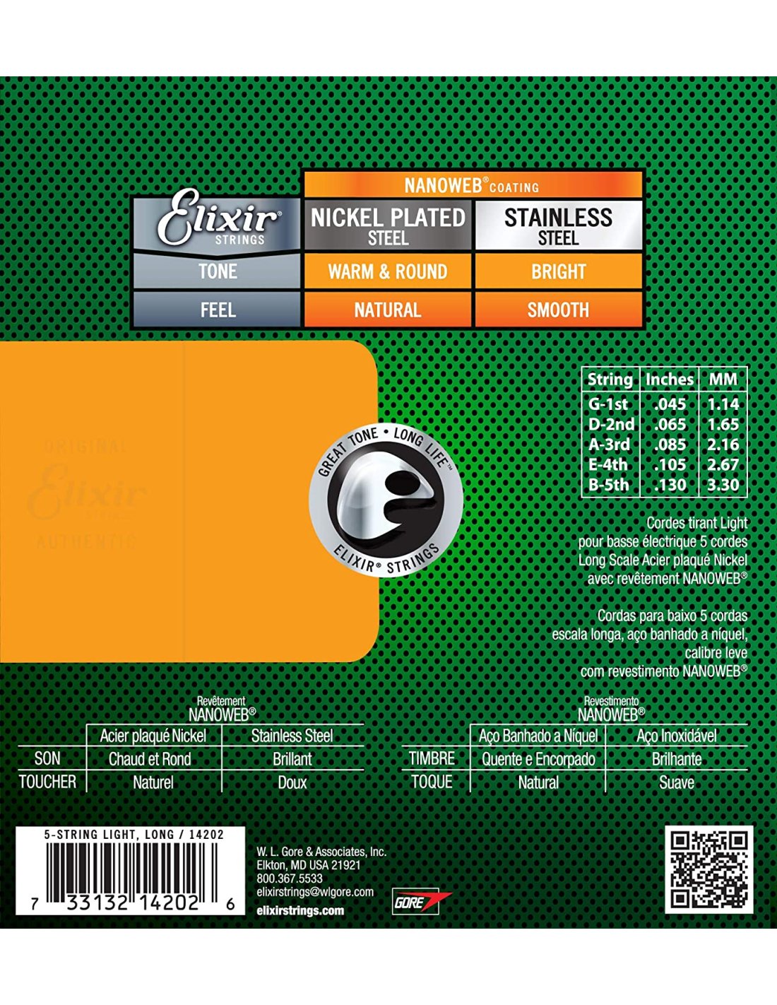 The Elixir 14202 Light Long Scale is a set of strings for 5-string electric bass in nickel-plated steel with Nanoweb coating, which protects them from corrosion and wear, in a scale of 045/130.