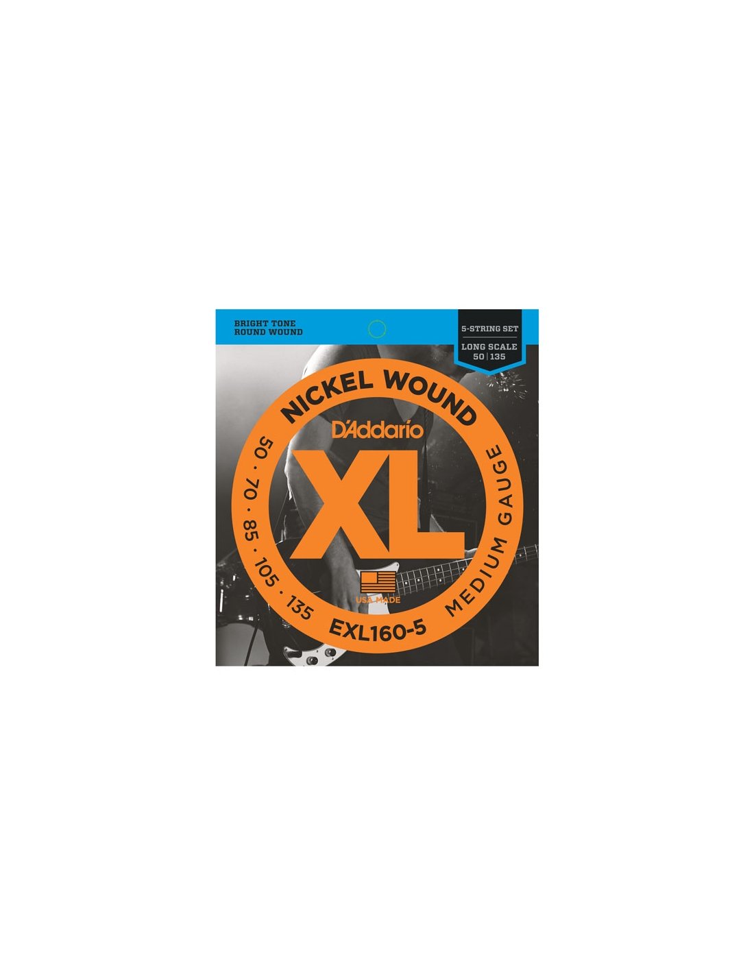 D'Addario EXL160-5 Electric Bass Strings. The D'Addario EXL160-5 are a nickel-wound 5-string electric bass string set with a medium scale of .050 .070 .085 .105 .135