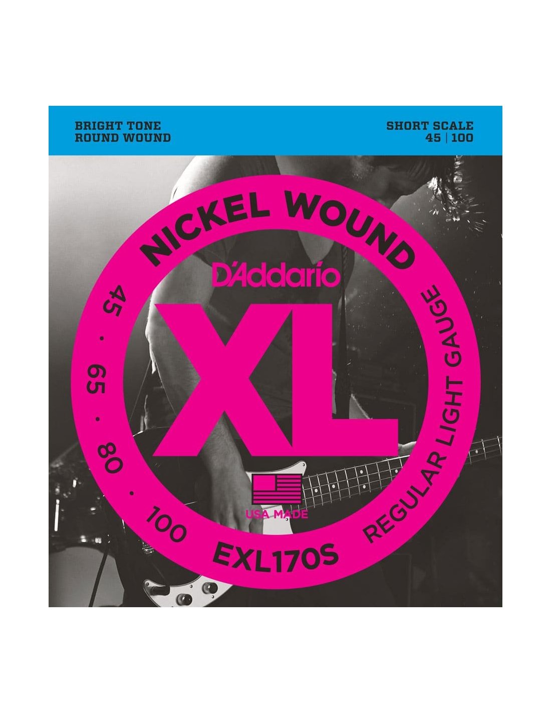 D'addario EXL170S is a 045-100 short-scale bass set. The strings have a nickel-plated steel precision coating on a hexagon-shaped core
