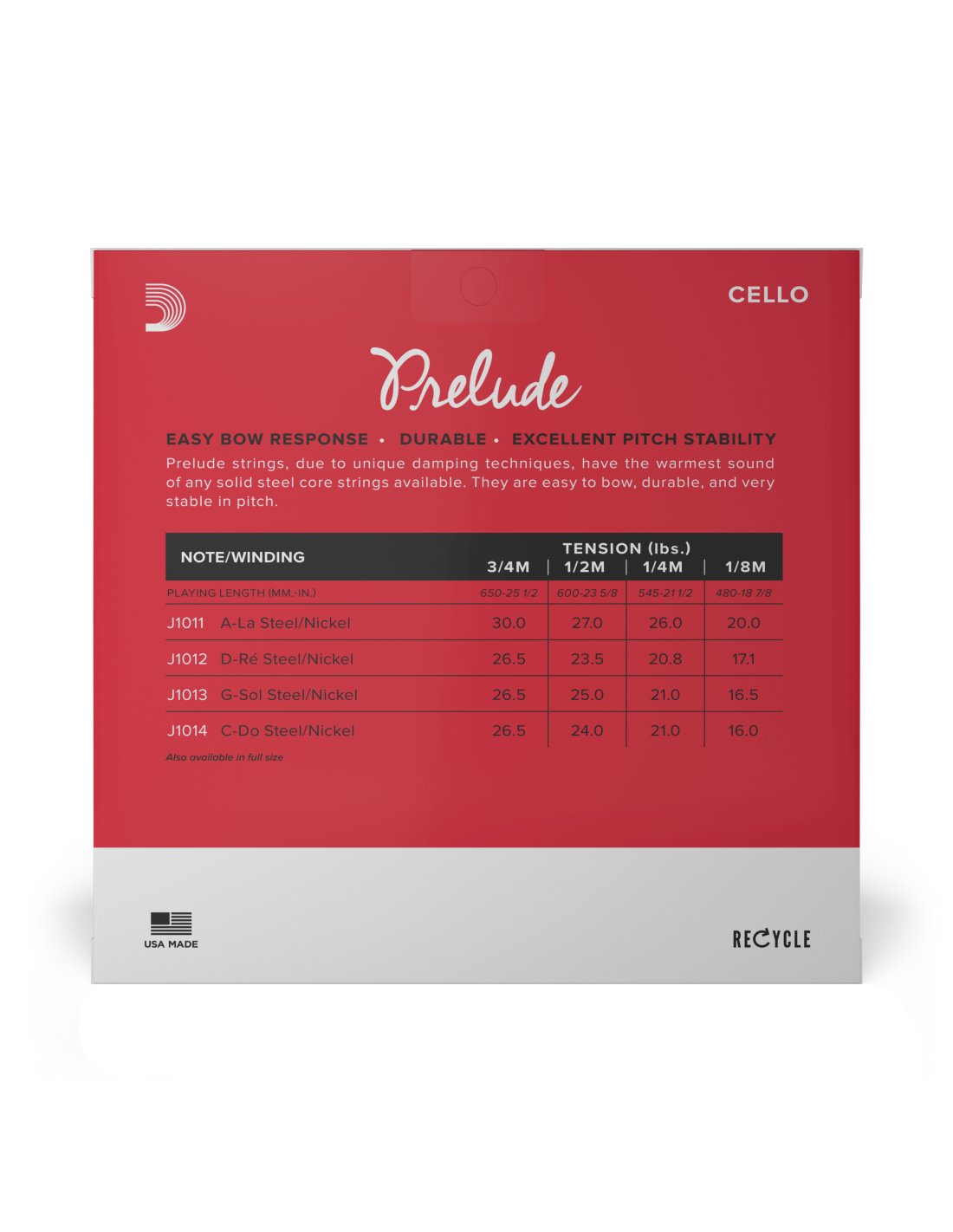 D'ADDARIO PRELUDE CELLO STRING SET, 1/2 SCALE, MEDIUM TENSION The Prelude cello strings are produced using a solid steel core. Unassailable to changes in temperature and humidity, these strings are distinguished by an excellent response to the stresses of the bow. The Prelude strings are characterized by the warmest sound in their category, and by a solid steel core. Prelude is teachers' favorite choice for their students, due to their unique formula that combines warm timbre, durability and convenience. Medium tension The steel core produces the warmest sound you can get from student strings. Cheap, durable and with warm sounds, they are the most chosen by music teachers for their students. All D'Addario strings are designed, manufactured and manufactured in the United States while complying with the strictest quality controls in the industry.