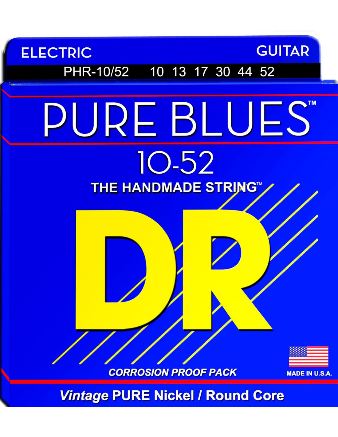 DR PHR 10/52 Pure Blues Electric Guitar Strings. The DR PHR 10/52 Pure Blues are a set of pure nickel round core electric guitar strings with a scale of .010 .013 .017 .030w .044w .052w.