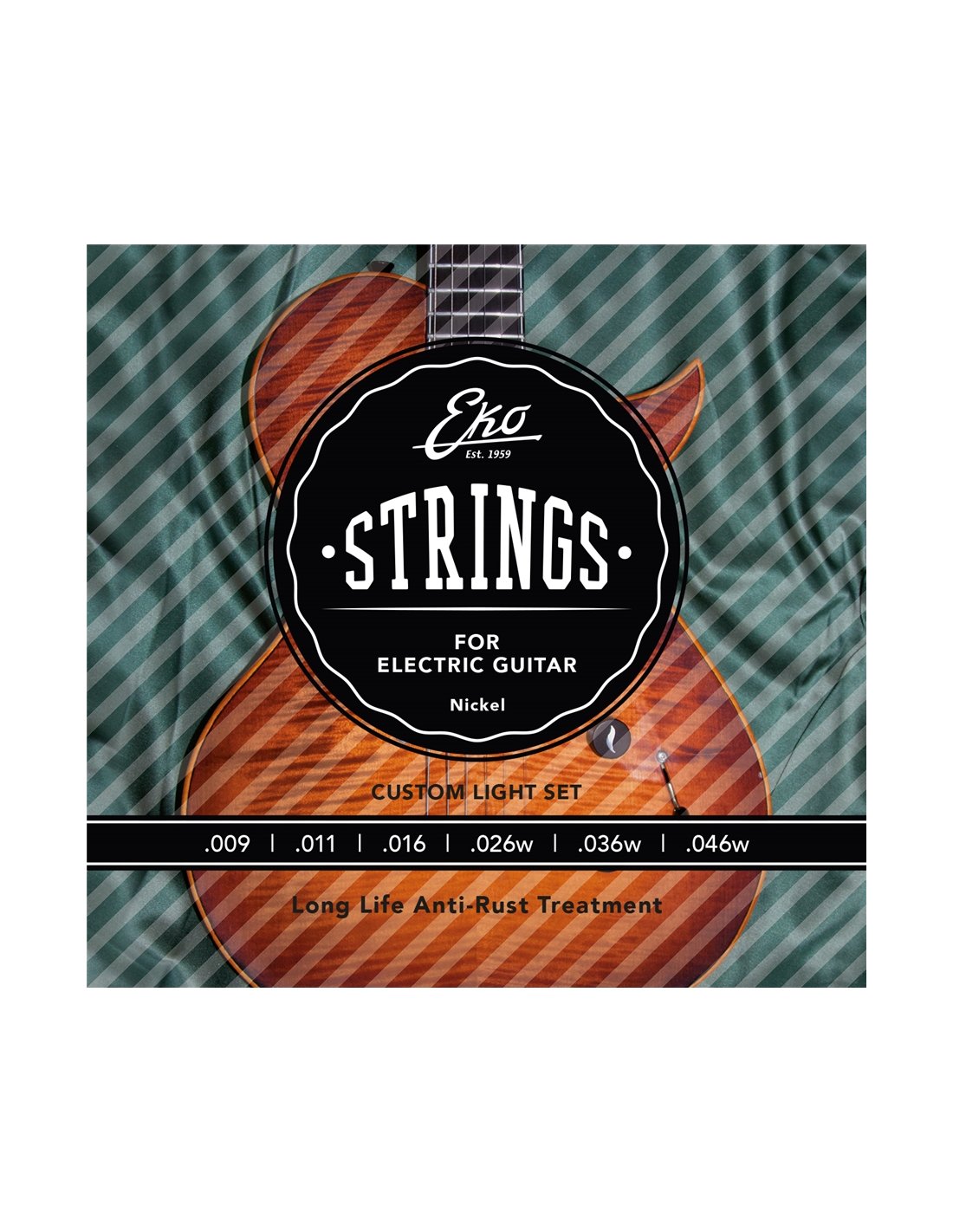 Eko Electric Guitar Strings Set 09/46. The Eko Electric Set 09/46 is a set of strings for electric guitar, nickel with a scale of .009 .011 .016 .026w .036w .046w.