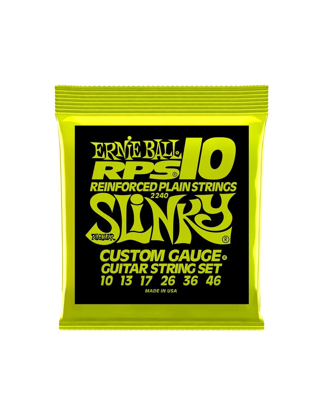 Ernie Ball RPS wound strings are characterized by specific calibers and relationships between soul and wrap, which create rich and balanced harmonics, and the unmistakable sensations to the touch of Slinky. The smooth strings in RPS wetsuits are longer lasting and hold better intonation than conventional smooth strings. A patented brass wire wrap is tightly twisted around the twisted lug of smooth strings. Ruptures and slips are reduced to a minimum at the end anchored to the bridge, the area normally most subject to these inconveniences. Diameters: .010, .013, .017, .026, .036, .046