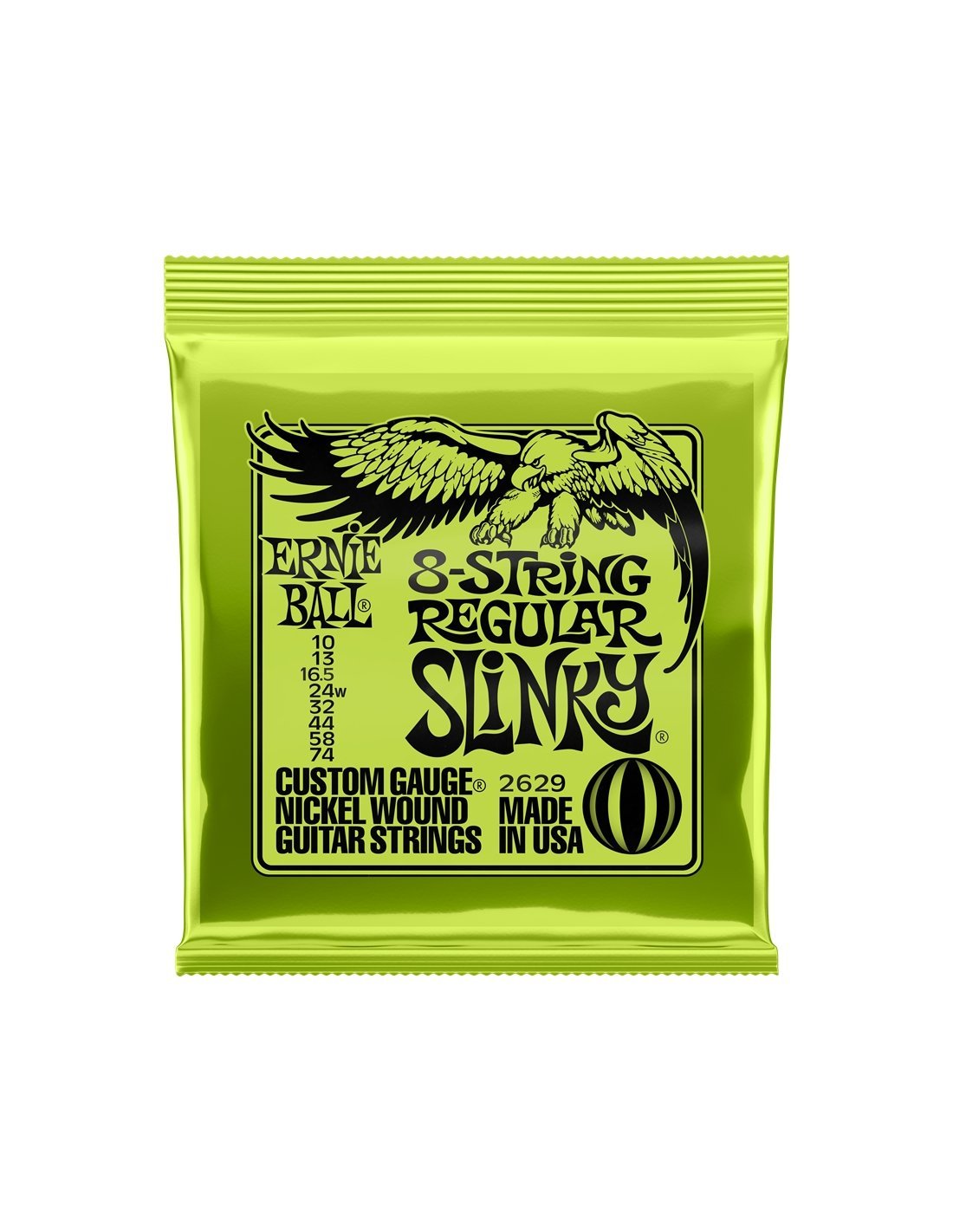 8-String Regular Slinky is Ernie Ball's 8-string electric guitar string set, designed for the guitarist who uses multi-scale guitars and who loves the classic Slinky feel and an excellent balance between the strings. Perfect for hard rock and heavy metal genres.