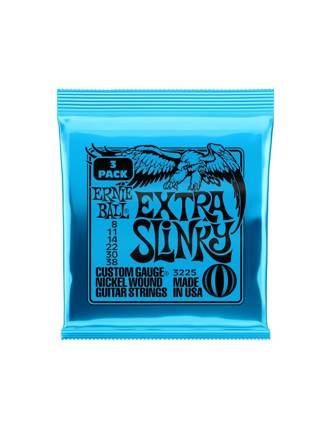 3225 is the pack of three sets of electric guitar strings from the Extra Slinky Nickel Wound series with a scale of 8-38 by Ernie Ball. They are built with a nickel-plated steel wire, wrapped around a hexagonal steel core. The smooth strings are constructed from tin-plated hardened high-carbon steel, and produce a well-balanced sound
