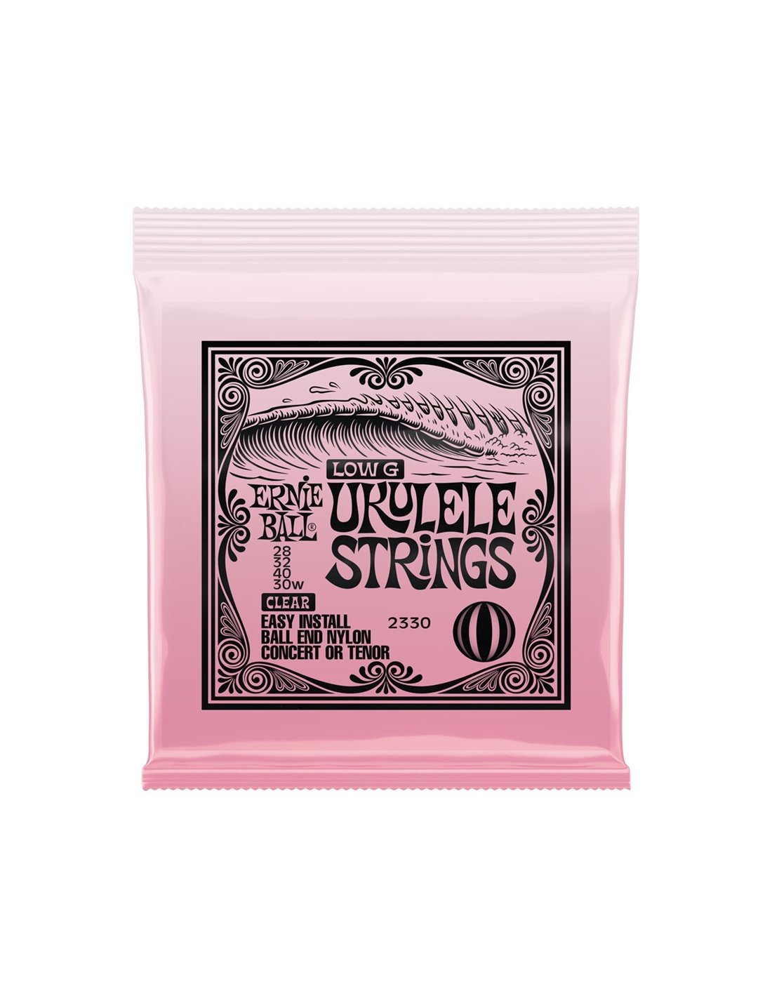 end ukulele string sets feature the latest low G string, 0.030" in diameter. This new gauge combination is ideal for those who want to tune their ukulele with the 'Low G' tuning, more similar to the traditional guitar. These new ukulele strings are made from 100% nylon monofilament, while the wrapped G string is made from 80/20 bronze wrapped nylon multifilament. Ernie Ball Ukulele strings are characterized by a ball end for easy installation, in transparent traditional resin for a bright and balanced tone with excellent projection and in black resin for a warm and rich tone with a percussive attack