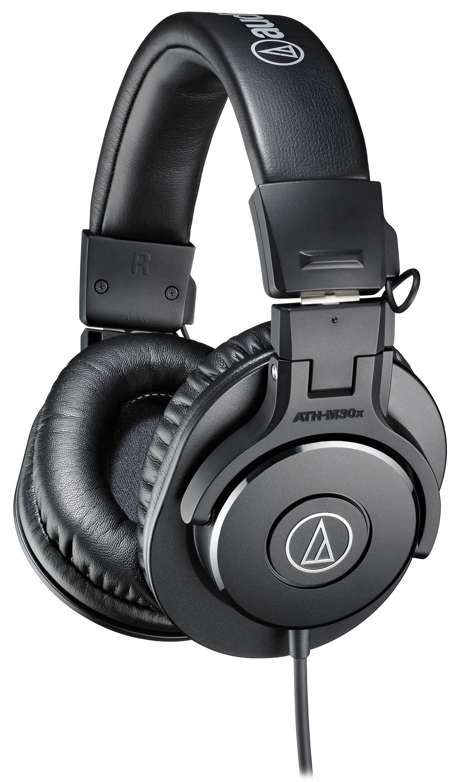 AUDIO TECHNICA ATH-M30X. Professional Over-Ear closed studio headphone with foldable ear cups, 40mm neodymium driver and copper-coated coil, 15Hz - 22kHz frequency response, 3m straight cable with output on the left earcup. Soft case and 6.3 mm jack adapter included