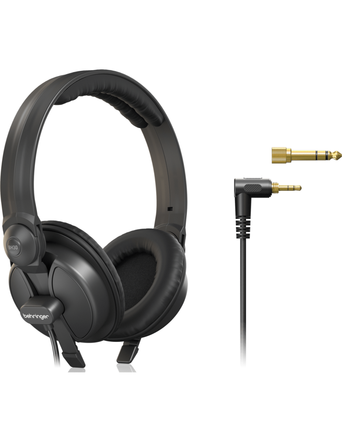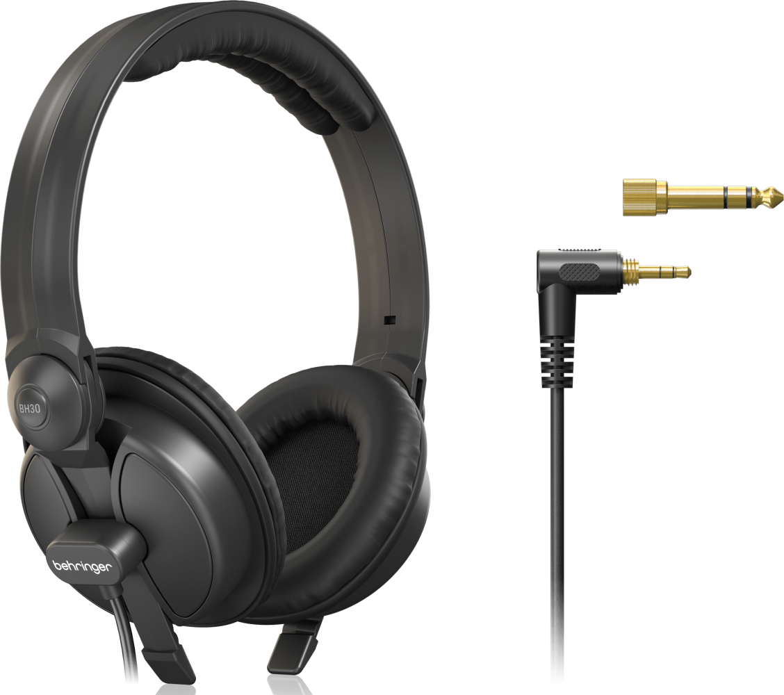 BEHRINGER BH30. Over-Ear DJ closed headphone with 30mm neodymium driver, swivel earcups, adjustable headband, dual band design, 20Hz - 22kHz frequency response, 3m spiral cable with gold-plated 3.5mm jack connector. Gold-plated 6.3 mm jack threaded adapter included