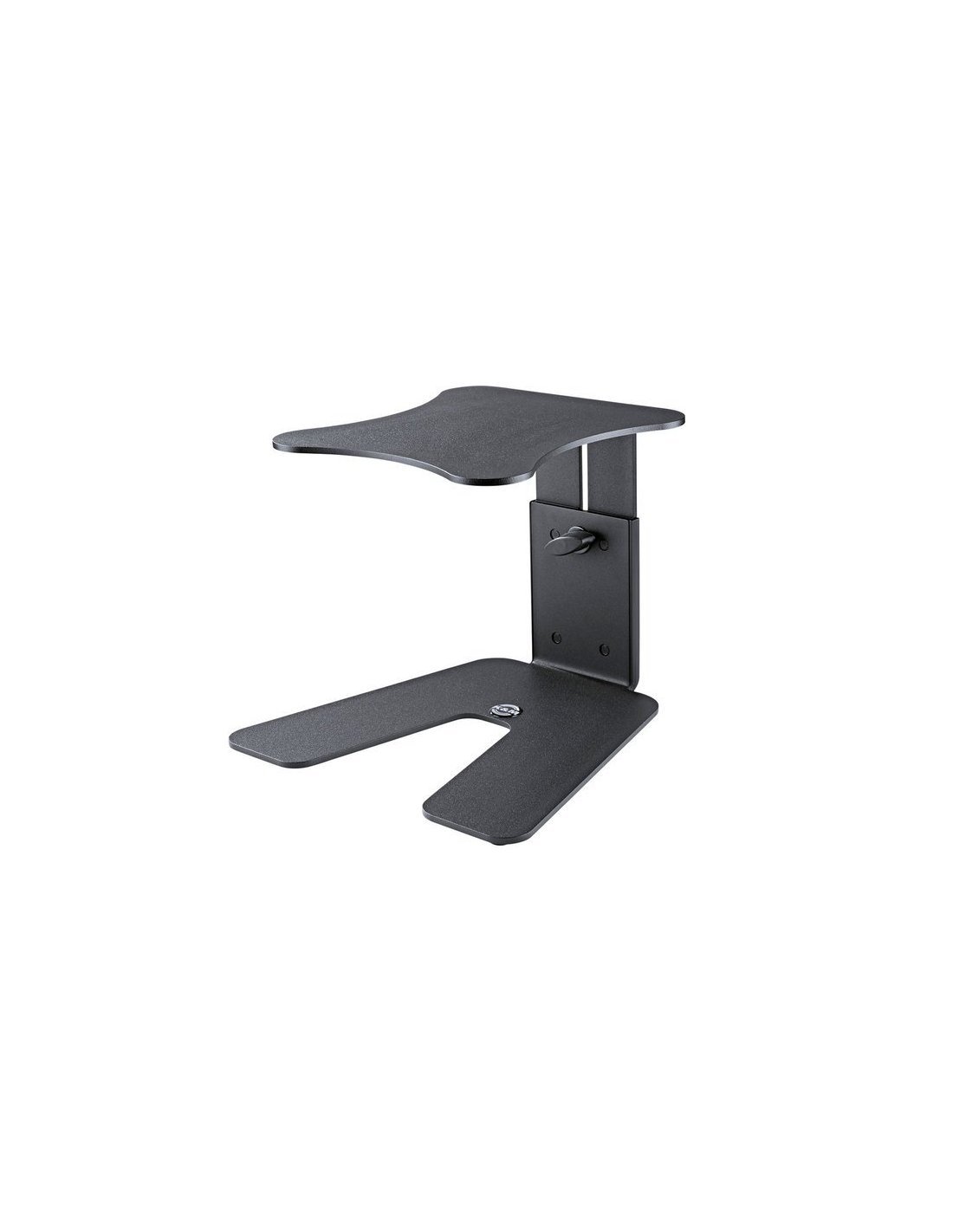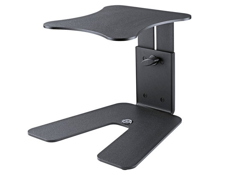 K&M 26774-000-55 TABLE MONITOR STAND. Steel desktop stand for studio monitors. Recommended maximum load 15 kg, table top dimensions 23x25 cm, height adjustment up to a maximum of 25 cm. Equipped with 4 rubber pads to filter the noise on the stand