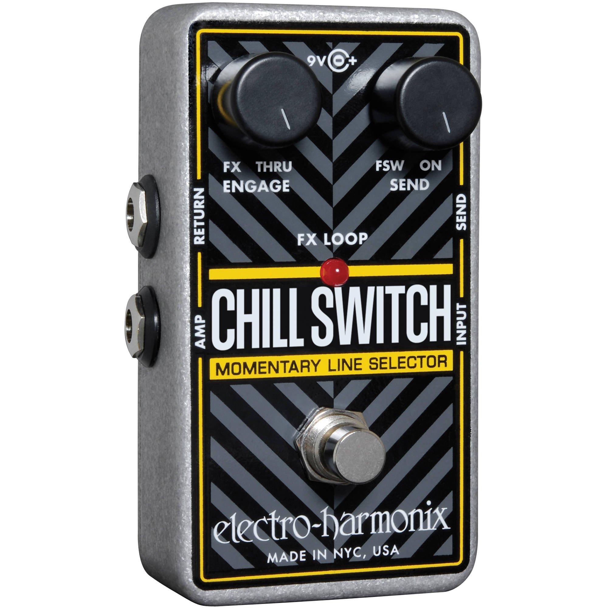 Electro Harmonix Chillswitch Momentary Line Selector Guitar Pedal. The Electro Harmonix Chillswitch Momentary Line Selector is a guitar pedal that can be used to provide instant mute, interrupting and reactivating the instrument's signal abruptly. In Line Selector mode, it can be used as loop effects. It is equipped with the Engage, Send controls.