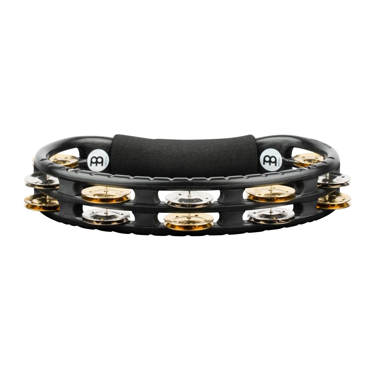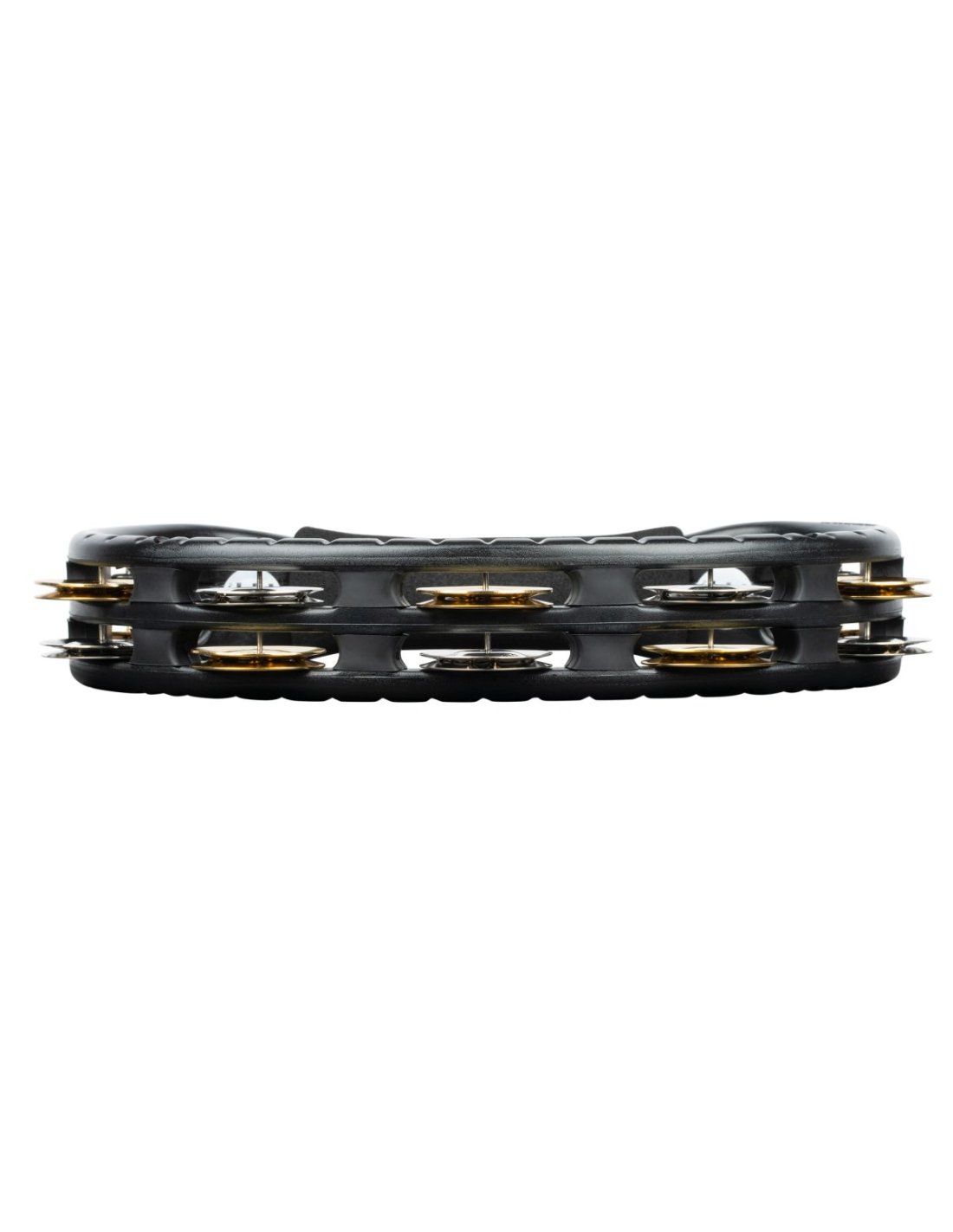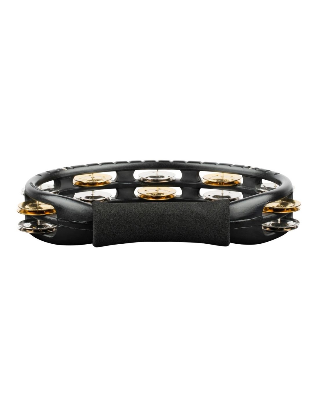 'Soft padded handle for maximum comfort Ergonomic design Guiro rough frame Position of sandwich jingles for maximum resonance 14 pairs of steel and brass jingles in a double row ABS frame Color: Black Perfect for any musician, from percussionists and drummers to singers and horn players, this portable tambourine has a balanced feel to easily add movement or accents to your music. 14 pairs of mixed jingles in nickel silver plate steel and solid brass respond with a brilliant attack and a warm tone, with a sharp volume. The jingles are mounted in a special “sandwich” position with the flanged edges facing each other for a more precise attack and full resonance. The crescent shaped frame made with ultra resistant synthetic material made to last. It features a rippled 'guiro' style surface on which you can drag a wand for sound effects. '